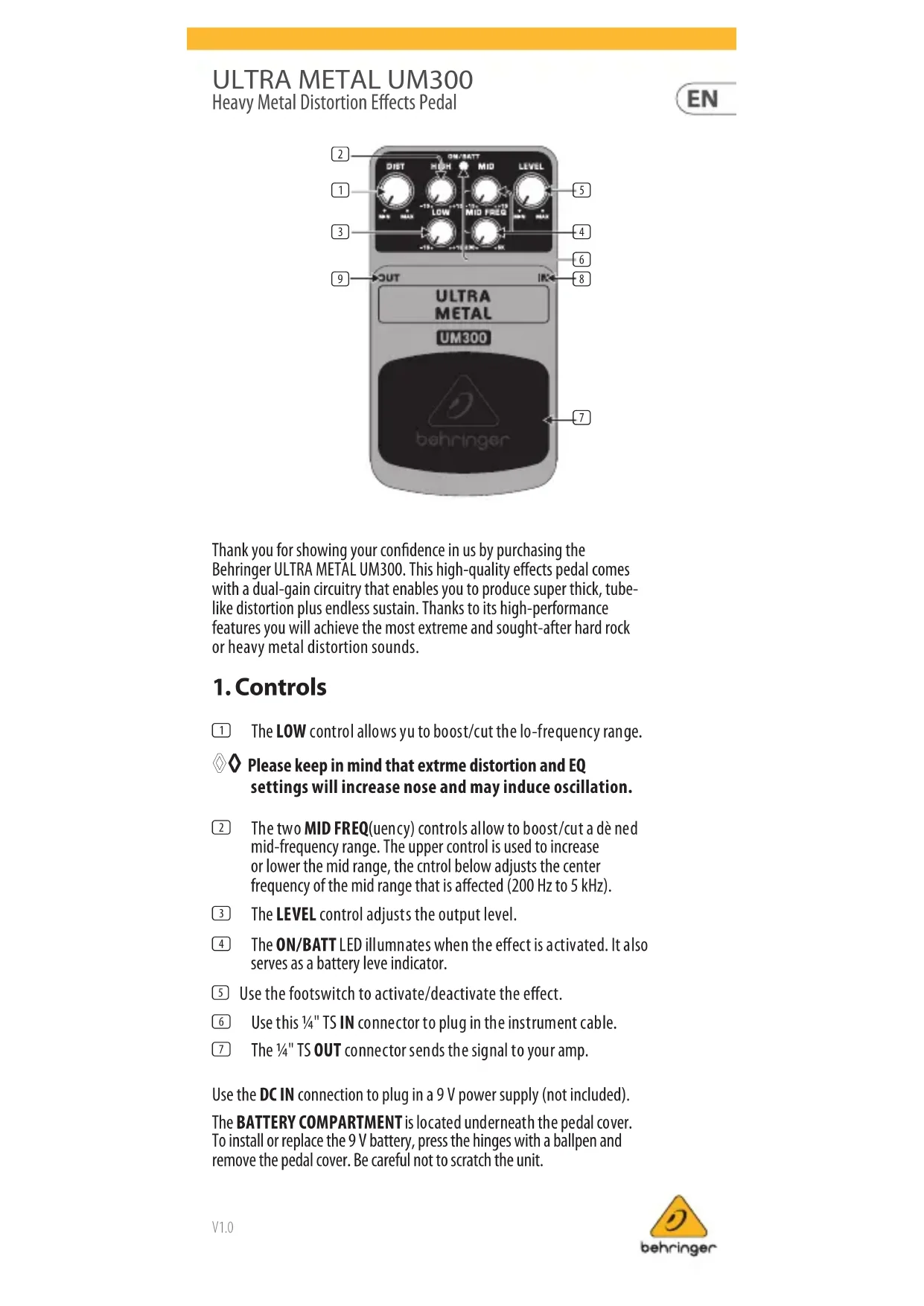(1) The LOW control allows yu to boost/cut the lo-frequency range. ◊◊ Please keep in mind that extrme distortion and EQ settings will increase nose and may induce oscillation. (2) The two MID FREQ(uency) controls allow to boost/cut a dè ned mid-frequency range. The upper control is used to increase or lower the mid range, the cntrol below adjusts the center frequency of the mid range that is aected (200 Hz to 5 kHz). (3) The LEVEL control adjusts the output level. (4) The ON/BATT LED illumnates when the eect is activated. It also serves as a battery leve indicator. (5) Use the footswitch to activate/deactivate the eect. (6) Use this ¼" TS IN connector to plug in the instrument cable. (7) The ¼" TS OUT connector sends the signal to your amp. Use the DC IN connection to plug in a 9 V power supply (not included). The BATTERY COMPARTMENT is located underneath the pedal cover. To install or replace the 9 V battery, press the hinges with a ballpen and remove the pedal cover. Be careful not to scratch the unit.V1.0