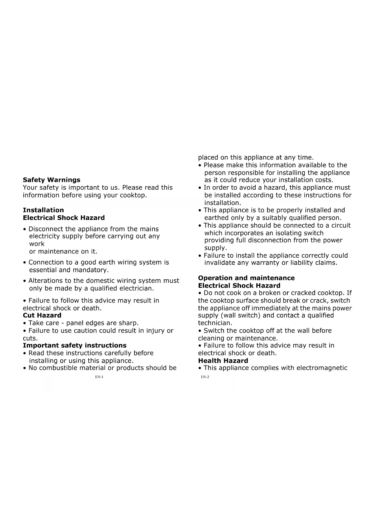 - Failure to install the appliance correctly could invalidate any warranty or liability claims. Operation and maintenance Electrical Shock Hazard