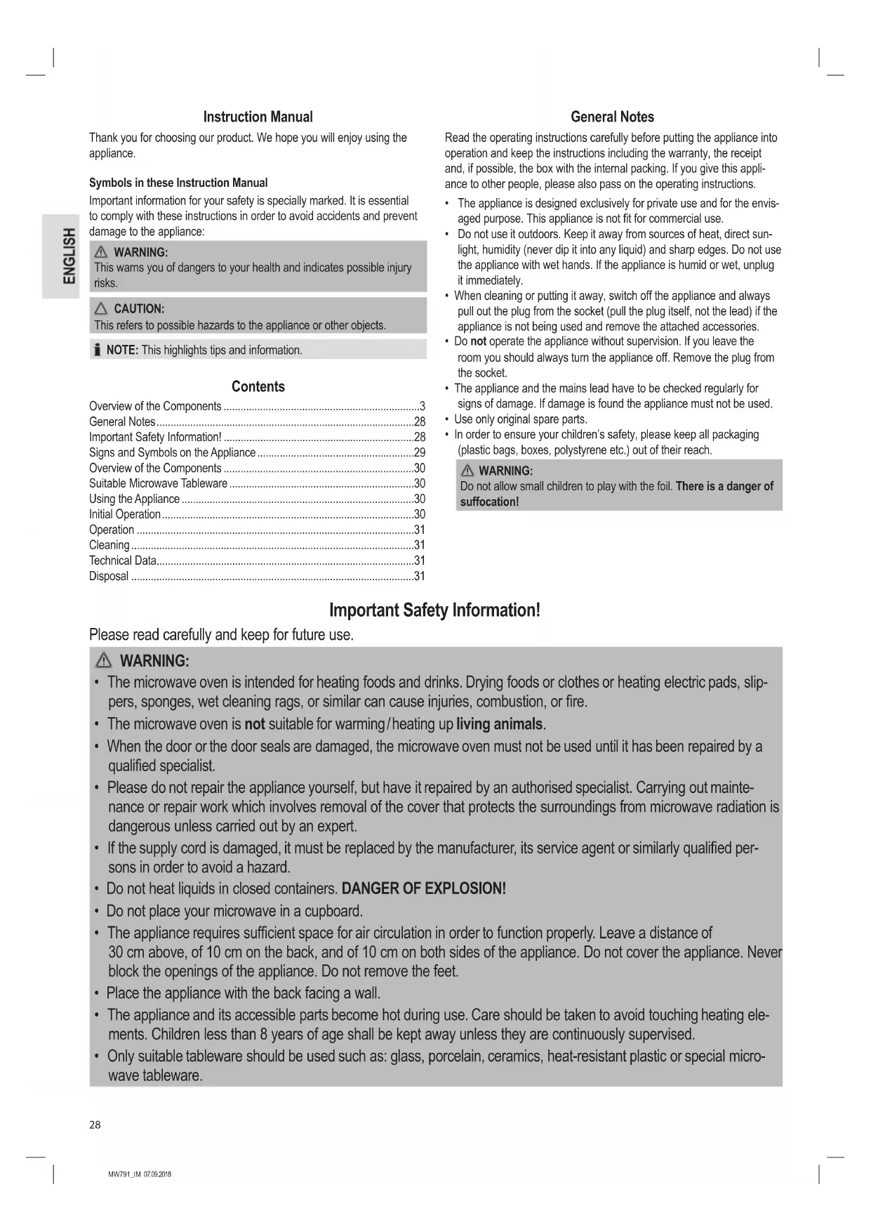 - Only suitable tableware should be used such as: glass, porcelain, ceramics, heat-resistant plastic or special micro- wave tableware.29 MW791_IM 07.09.2018