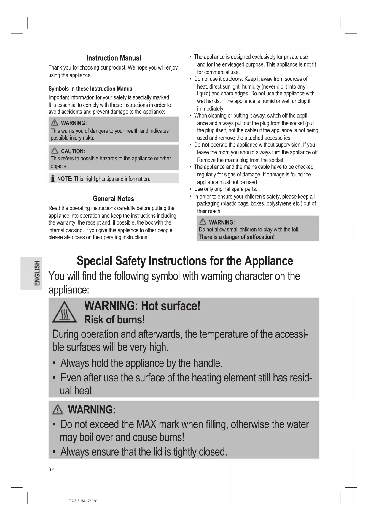 - This appliance is used for making tea. Never use to heat up other uids or foodstuffs. This can cause injury.TK3715_IM 17.10.18