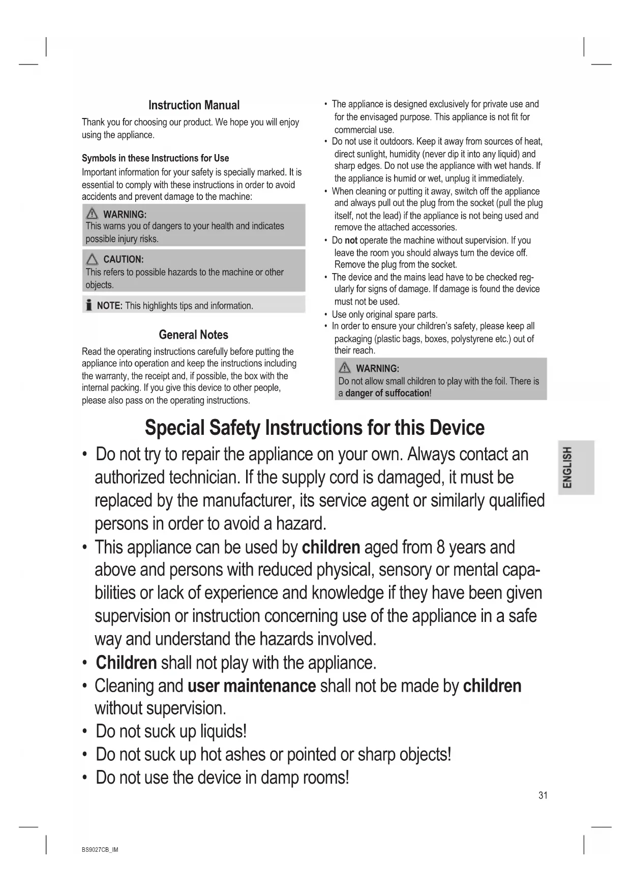 - Do not use the device in damp rooms!32 BS9027CB_IM 08.03.16
