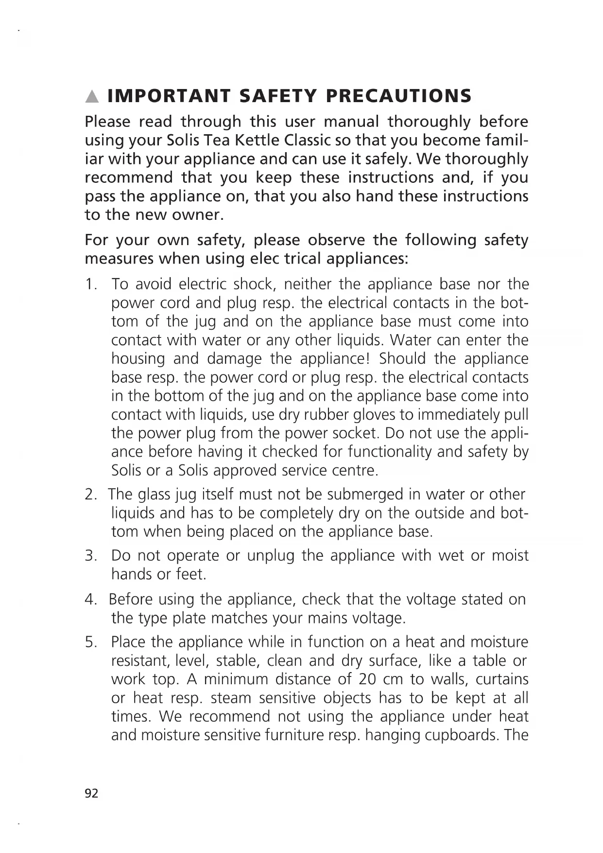 Please read through this user manual thoroughly before using your Solis Tea Kettle Classic so that you become famil- iar with your appliance and can use it safely. We thoroughly recommend that you keep these instructions and, if you pass the appliance on, that you also hand these instructions to the new owner. For your own safety, please observe the following safety measures when using elec trical appliances: