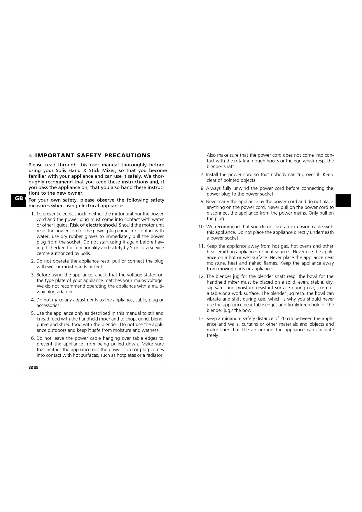 Please read through this user manual thoroughly before using your Solis Hand & Stick Mixer, so that you become familiar with your appliance and can use it safely. We thor- oughly recommend that you keep these instructions and, if you pass the appliance on, that you also hand these instruc- tions to the new owner. For your own safety, please observe the following safety measures when using electrical appliances: