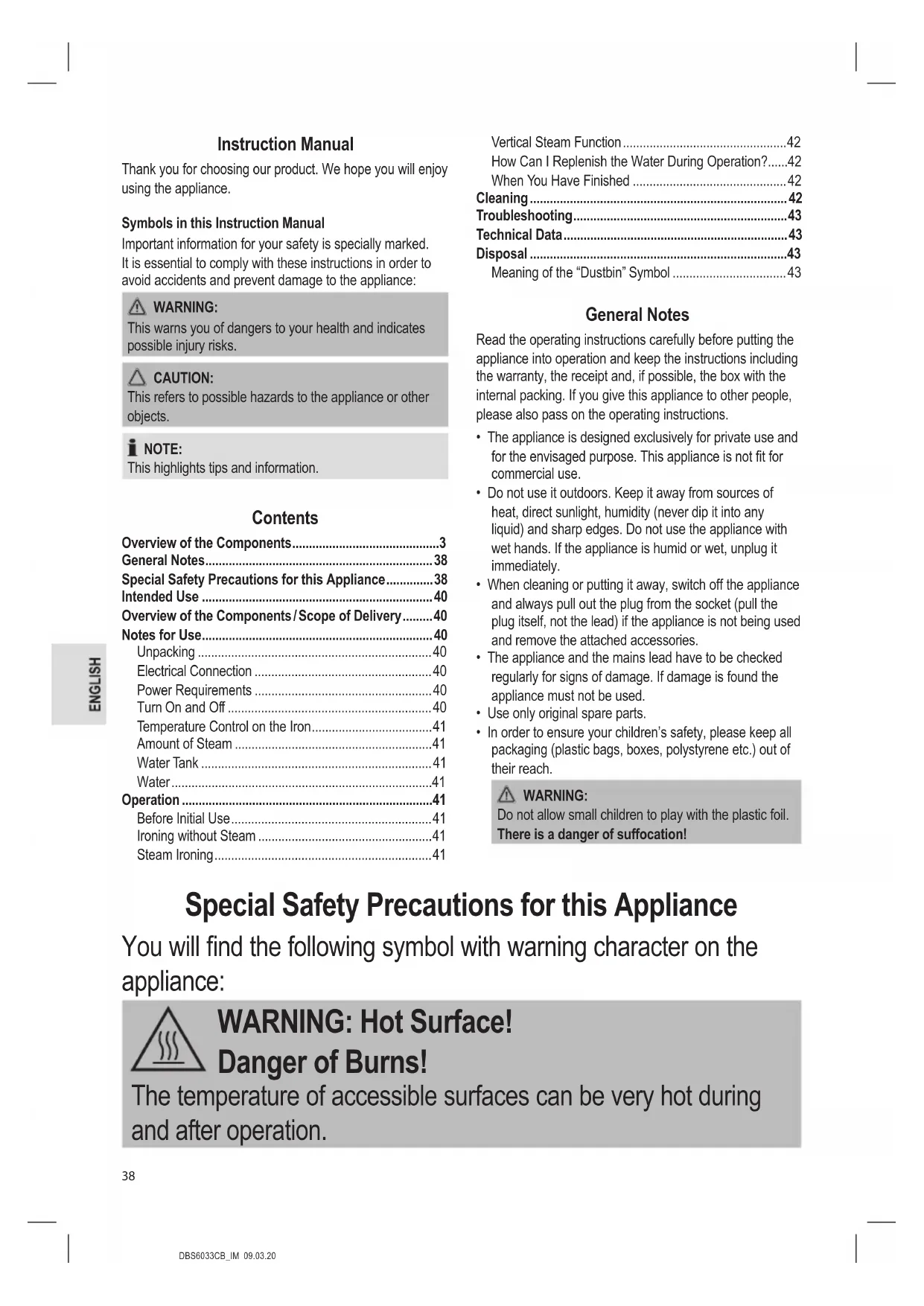 Troubleshooting Fault Possible Cause Remedy Appliance does not work. Faulty mains socket. Try another socket. The appliance suddenly stops working during operation. Is the electric circuit overloaded? Check the house fuse. No steam is generated. The water tank has not been installed correctly. Firmly push the water tank into the base. Water leaks from the soleplate. The temperature is set too low. Select a temperature between “ ” and “ ” . Loud noises during steam operation. The tank is empty. Check the tank. Fill tank with water. Initial start-up or after long periods of disuse. These noises of the pump are normal. Technical Data Model:...............................................................DBS 6033 CB Power supply:...........................................220 - 240 V~, 50 Hz Power consumption: ...................................................3000 W Protection class: ..................................................................... Maximum lling quantity of the water tank: ................1.0 litre Net weight: .......................................................... approx. 3 kg The right to make technical and design modications in the course of continuous product development remains reserved. This appliance has been tested according to all relevant current CE guidelines, such as electromagnetic compatibility and low voltage directives, and is manufactured according to the latest safety regulations. Disposal Meaning of the “Dustbin” Symbol Protect our environment: do not dispose of electrical equipment in the domestic waste. Please return any electrical equipment that you will no longer use to the collection points provided for their disposal. This helps avoid the potential effects of incorrect disposal on the environment and human health. This will contribute to the recycling and other forms of re-utilisation of electrical and electronic equipment. Information concerning where the equipment can be dis- posed of can be obtained from your local authority.DBS6033CB_IM 09.03.20