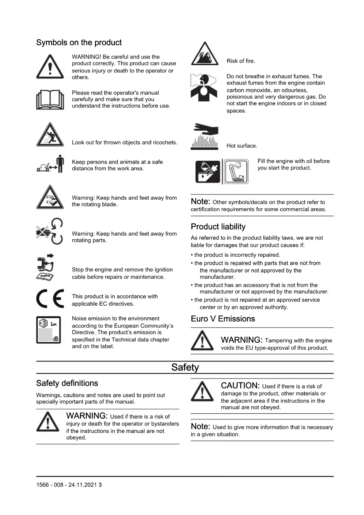 2 1566 - 008 - 24.11.2021Symbols on the product WARNING! Be careful and use the product correctly. This product can cause serious injury or death to the operator or others. Please read the operator's manual carefully and make sure that you understand the instructions before use. Look out for thrown objects and ricochets. Keep persons and animals at a safe distance from the work area.