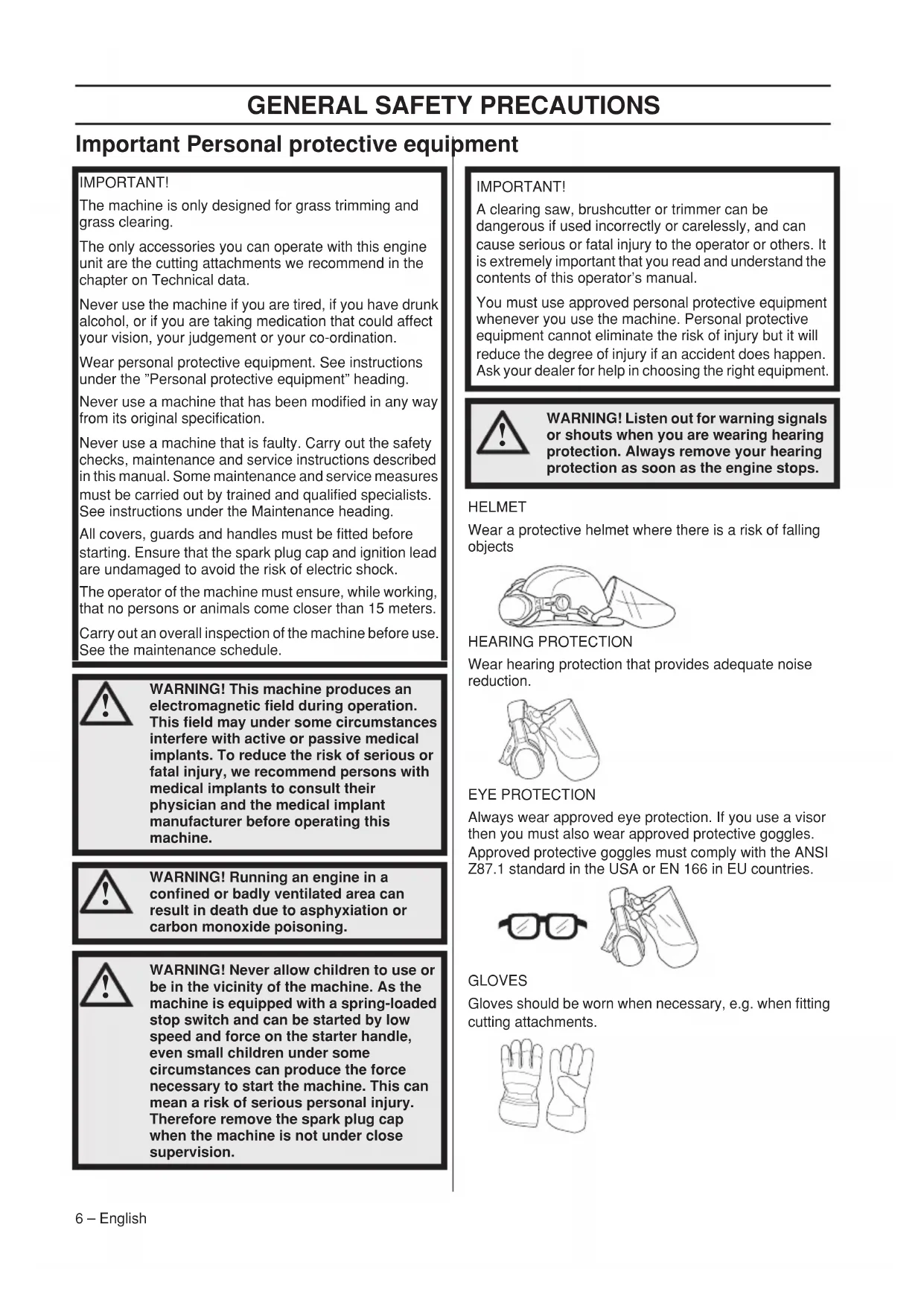 1 Trimmer head 2 Grease filler cap, bevel gear 3 Bevel gear 4 Cutting attachment guard 5 Shaft 6 Shaft coupling 7 Loop handle 8 Throttle trigger 9 Stop switch 10 Throttle trigger lockout 11 Spark plug cap and spark plug 12 Starter housing 13 Starter handle 14 Fuel tank 15 Air filter cover 16 Primer bulb 17 Choke control 18 Drive disc 19 Operator′s manual 20 Combination spanner 21 Locking pinGENERAL SAFETY PRECAUTIONS 6 – English Important Personal protective equipment HELMET Wear a protective helmet where there is a risk of falling objects HEARING PROTECTION Wear hearing protection that provides adequate noise reduction. EYE PROTECTION Always wear approved eye protection. If you use a visor then you must also wear approved protective goggles. Approved protective goggles must comply with the ANSI Z87.1 standard in the USA or EN 166 in EU countries. GLOVES Gloves should be worn when necessary, e.g. when fitting cutting attachments. IMPORTANT! The machine is only designed for grass trimming and grass clearing. The only accessories you can operate with this engine unit are the cutting attachments we recommend in the chapter on Technical data. Never use the machine if you are tired, if you have drunk alcohol, or if you are taking medication that could affect your vision, your judgement or your co-ordination. Wear personal protective equipment. See instructions under the ”Personal protective equipment” heading. Never use a machine that has been modified in any way from its original specification. Never use a machine that is faulty. Carry out the safety checks, maintenance and service instructions described in this manual. Some maintenance and service measures must be carried out by trained and qualified specialists. See instructions under the Maintenance heading. All covers, guards and handles must be fitted before starting. Ensure that the spark plug cap and ignition lead are undamaged to avoid the risk of electric shock. The operator of the machine must ensure, while working, that no persons or animals come closer than 15 meters. Carry out an overall inspection of the machine before use. See the maintenance schedule.
