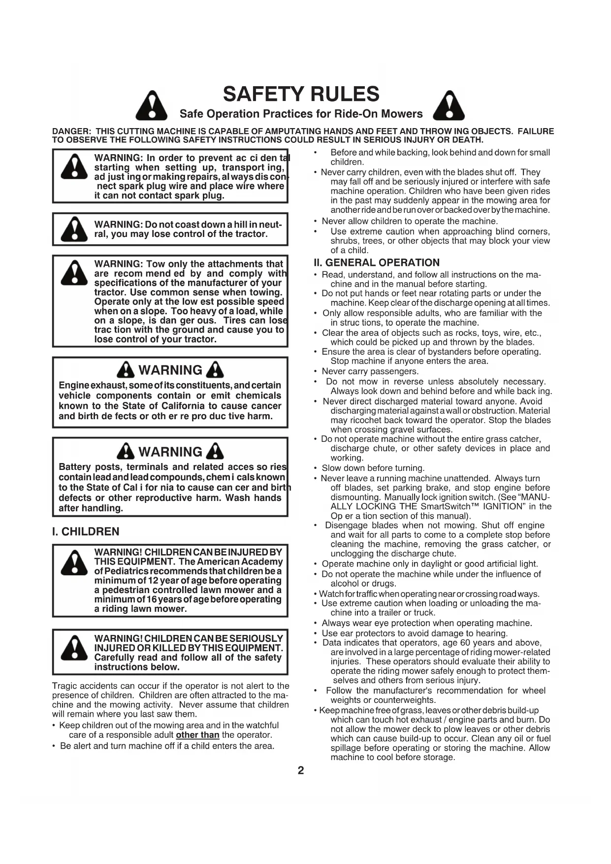 - Read, understand, and follow all instructions on the ma-chine and in the manual before starting.• Do not put hands or feet near rotating parts or under the machine. Keep clear of the discharge opening at all times.• Only allow responsible adults, who are familiar with the in struc tions, to operate the machine.• Clear the area of objects such as rocks, toys, wire, etc., which could be picked up and thrown by the blades.• Ensure the area is clear of bystanders before operating. Stop machine if anyone enters the area.• Never carry passengers.• Do not mow in reverse unless absolutely necessary. Always look down and behind before and while back ing.• Never direct discharged material toward anyone. Avoid discharging material against a wall or obstruction. Material may ricochet back toward the operator. Stop the blades when crossing gravel surfaces.• Do not operate machine without the entire grass catcher, discharge chute, or other safety devices in place and working.• Slow down before turning.• Never leave a running machine unattended. Always turn off blades, set parking brake, and stop engine before dismounting. Manually lock ignition switch. (See “MANU-ALLY LOCKING THE SmartSwitch™ IGNITION” in the Op er a tion section of this manual).• Disengage blades when not mowing. Shut off engine and wait for all parts to come to a complete stop before cleaning the machine, removing the grass catcher, or unclogging the discharge chute.• Operate machine only in daylight or good artificial light.• Do not operate the machine while under the influence of alcohol or drugs. • Watch for traffic when operating near or crossing road ways.• Use extreme caution when loading or unloading the ma-chine into a trailer or truck.• Always wear eye protection when operating machine.• Use ear protectors to avoid damage to hearing.• Data indicates that operators, age 60 years and above, are involved in a large percentage of riding mower-related injuries. These operators should evaluate their ability to operate the riding mower safely enough to protect them- selves and others from serious injury.• Follow the manufacturer's recommendation for wheel weights or counterweights.• Keep machine free of grass, leaves or other debris build-up which can touch hot exhaust / engine parts and burn. Do not allow the mower deck to plow leaves or other debris which can cause build-up to occur. Clean any oil or fuel spillage before operating or storing the machine. Allow machine to cool before storage.