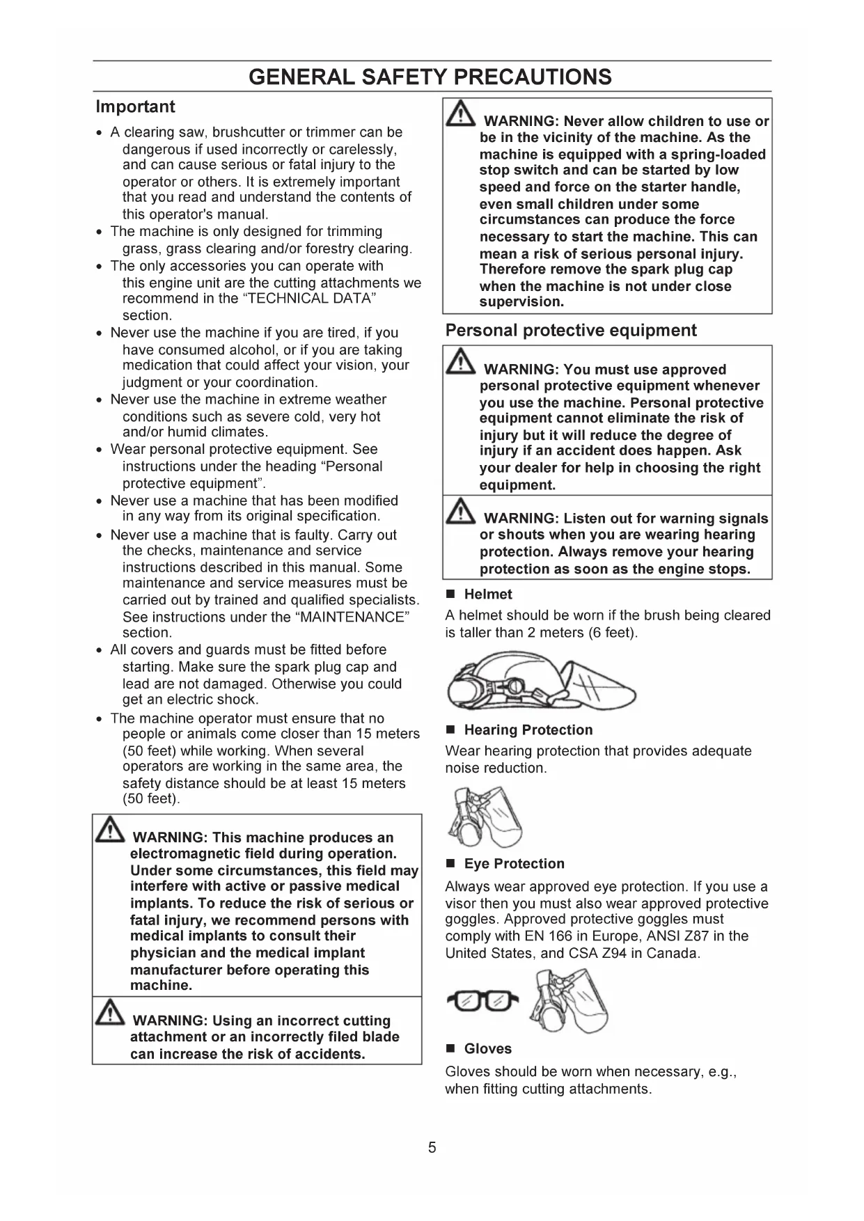 brushcutters and trimmers can be dangerous. Careless or incorrect use can result in serious or fatal injury to the operator or others. Please read the operator's manual carefully and make sure you understand the instructions before using the machine. Always use steel-toed safety footwear with non-slip soles; snug- fitting clothing; heavy, long pants, and long sleeves; heavy-duty, non-slip gloves; eye protection such as non-fogging, vented goggles or face screen; an approved safety helmet; and sound barriers (ear plugs or mufflers) to protect your hearing. Persons with long hair should (for personal safety) put their hair up. The operator of the machine shall ensure, while working, that no persons or animals come closer than 15 meters (50 feet).