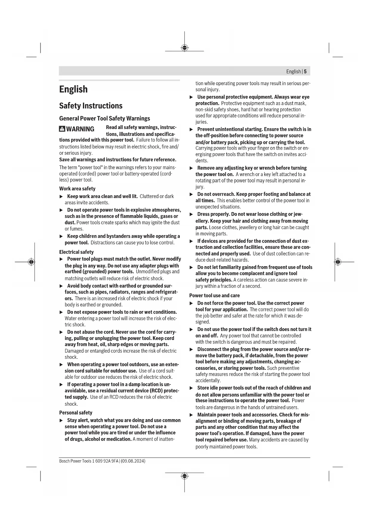 (23) (16) (24) (25) (26) (27) 1 609 92A 9FA | (09.08.2024) Bosch Power ToolsEnglish | 5 English Safety Instructions General Power Tool Safety Warnings WARNING Read all safety warnings, instruc- tions, illustrations and specifica- tions provided with this power tool. Failure to follow all in- structions listed below may result in electric shock, fire and/ or serious injury. Save all warnings and instructions for future reference. The term "power tool" in the warnings refers to your mains- operated (corded) power tool or battery-operated (cord- less) power tool. Work area safety u Keep work area clean and well lit. Cluttered or dark areas invite accidents. u Do not operate power tools in explosive atmospheres, such as in the presence of flammable liquids, gases or dust. Power tools create sparks which may ignite the dust or fumes. u Keep children and bystanders away while operating a power tool. Distractions can cause you to lose control. Electrical safety u Power tool plugs must match the outlet. Never modify the plug in any way. Do not use any adapter plugs with earthed (grounded) power tools. Unmodified plugs and matching outlets will reduce risk of electric shock. u Avoid body contact with earthed or grounded sur- faces, such as pipes, radiators, ranges and refrigerat- ors. There is an increased risk of electric shock if your body is earthed or grounded. u Do not expose power tools to rain or wet conditions. Water entering a power tool will increase the risk of elec- tric shock. u Do not abuse the cord. Never use the cord for carry- ing, pulling or unplugging the power tool. Keep cord away from heat, oil, sharp edges or moving parts. Damaged or entangled cords increase the risk of electric shock. u When operating a power tool outdoors, use an exten- sion cord suitable for outdoor use. Use of a cord suit- able for outdoor use reduces the risk of electric shock. u If operating a power tool in a damp location is un- avoidable, use a residual current device (RCD) protec- ted supply. Use of an RCD reduces the risk of electric shock. Personal safety u Stay alert, watch what you are doing and use common sense when operating a power tool. Do not use a power tool while you are tired or under the influence of drugs, alcohol or medication. A moment of inatten- tion while operating power tools may result in serious per- sonal injury. u Use personal protective equipment. Always wear eye protection. Protective equipment such as a dust mask, non-skid safety shoes, hard hat or hearing protection used for appropriate conditions will reduce personal in- juries. u Prevent unintentional starting. Ensure the switch is in the off-position before connecting to power source and/or battery pack, picking up or carrying the tool. Carrying power tools with your finger on the switch or en- ergising power tools that have the switch on invites acci- dents. u Remove any adjusting key or wrench before turning the power tool on. A wrench or a key left attached to a rotating part of the power tool may result in personal in- jury. u Do not overreach. Keep proper footing and balance at all times. This enables better control of the power tool in unexpected situations. u Dress properly. Do not wear loose clothing or jew- ellery. Keep your hair and clothing away from moving parts. Loose clothes, jewellery or long hair can be caught in moving parts. u If devices are provided for the connection of dust ex- traction and collection facilities, ensure these are con- nected and properly used. Use of dust collection can re- duce dust-related hazards. u Do not let familiarity gained from frequent use of tools allow you to become complacent and ignore tool safety principles. A careless action can cause severe in- jury within a fraction of a second. Power tool use and care u Do not force the power tool. Use the correct power tool for your application. The correct power tool will do the job better and safer at the rate for which it was de- signed. u Do not use the power tool if the switch does not turn it on and off. Any power tool that cannot be controlled with the switch is dangerous and must be repaired. u Disconnect the plug from the power source and/or re- move the battery pack, if detachable, from the power tool before making any adjustments, changing ac- cessories, or storing power tools. Such preventive safety measures reduce the risk of starting the power tool accidentally. u Store idle power tools out of the reach of children and do not allow persons unfamiliar with the power tool or these instructions to operate the power tool. Power tools are dangerous in the hands of untrained users. u Maintain power tools and accessories. Check for mis- alignment or binding of moving parts, breakage of parts and any other condition that may affect the power tool’s operation. If damaged, have the power tool repaired before use. Many accidents are caused by poorly maintained power tools. Bosch Power Tools 1 609 92A 9FA | (09.08.2024)6 | English u Keep cutting tools sharp and clean. Properly main- tained cutting tools with sharp cutting edges are less likely to bind and are easier to control. u Use the power tool, accessories and tool bits etc. in accordance with these instructions, taking into ac- count the working conditions and the work to be per- formed. Use of the power tool for operations different from those intended could result in a hazardous situation. u Keep handles and grasping surfaces dry, clean and free from oil and grease. Slippery handles and grasping surfaces do not allow for safe handling and control of the tool in unexpected situations. Service u Have your power tool serviced by a qualified repair person using only identical replacement parts. This will ensure that the safety of the power tool is maintained. Safety instructions for circular saws Cutting procedures u DANGER: Keep hands away from cutting area and the blade. Keep your second hand on auxiliary handle, or motor housing. If both hands are holding the saw, the