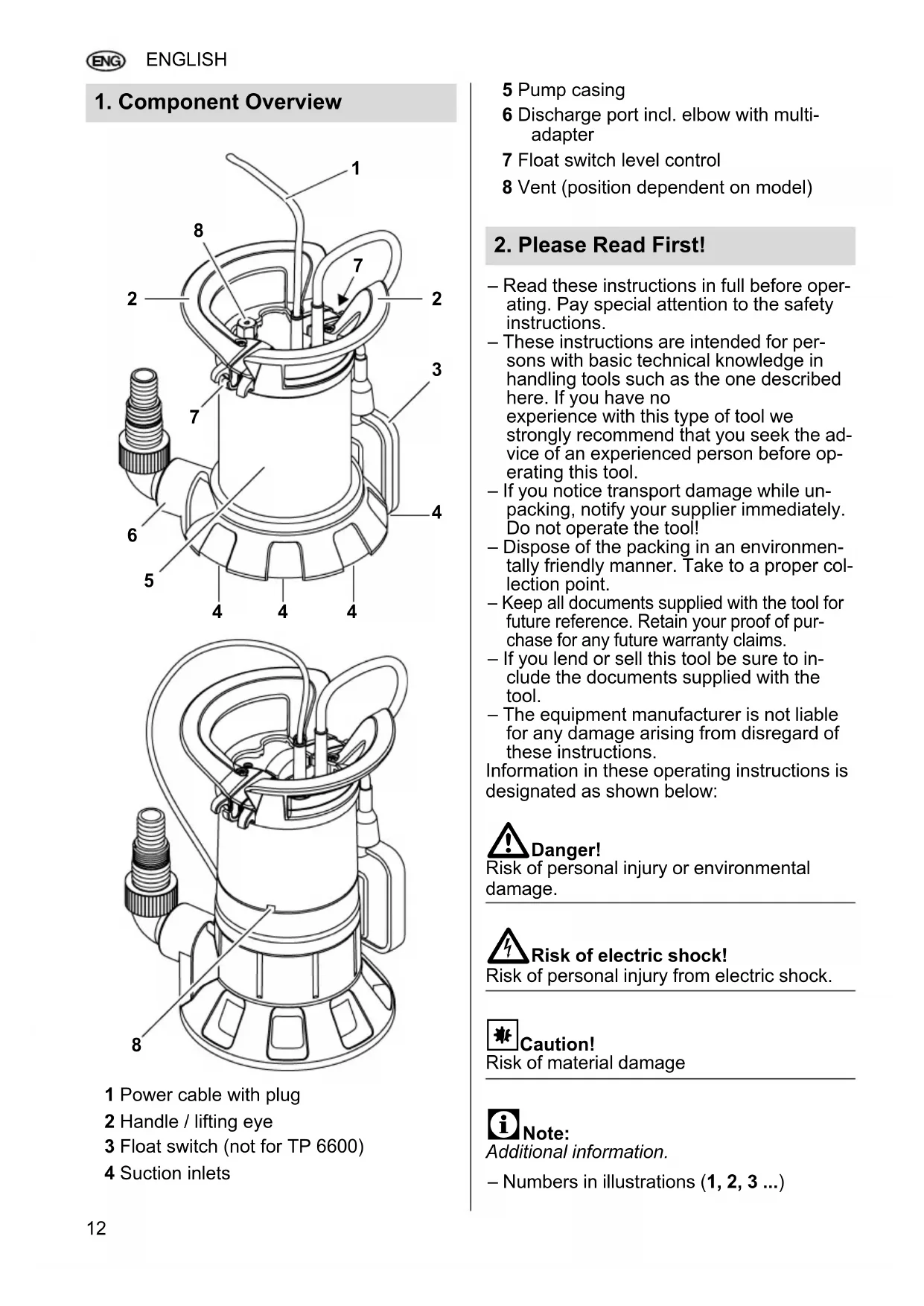 ENGLISH BDanger! Risk of electric shock! Do not touch the plug with wet hands! To un- plug always pull on the plug, not the power cable. Connect only to an earthed outlet that is properly installed, earthed and tested. Mains voltage and fuse protection must correspond to those stated in the 'Technical Specifica- tions'. Always lift and transport the pump by the handle, never by the power cable or dis- charge hose. Extension cables must have sufficient con- ductor cross sections. Unroll cable reels ful- ly. Do not buckle, squeeze, drag or drive over power cable or extension cables; protect from sharp edges, oil and heat. Place extension cable so that it can not get into the fluid to be pumped. Always unplug before servicing the pump. BRisk of electric shock from pump faults! Before each use check the equipment, espe- cially the power and extension cables, power plug and float switch for possible damage. Risk of fatal electric shock! Do not attempt to repair the pump yourself! When repaired inexpertly there is a hazard of liquid entering the electrical parts of the pump. A Caution! To avoid water damage, e.g. flooded rooms, caused by pump malfunctions or defects: provide for suitable safety measures such as the following: – alarm or – collection tank with monitoring. The manufacturer is not liable for any dam- age caused by: – improper use of the pump; – overloading of the pump through conti- nous operation; – failure to operate and store the pump in a frost-free environment; – unauthorised modification of the pump (re- pairs to electrical equipment may only be carried out by qualified electricians!); – use of spare parts which have not been tested and approved by the manufacturer;