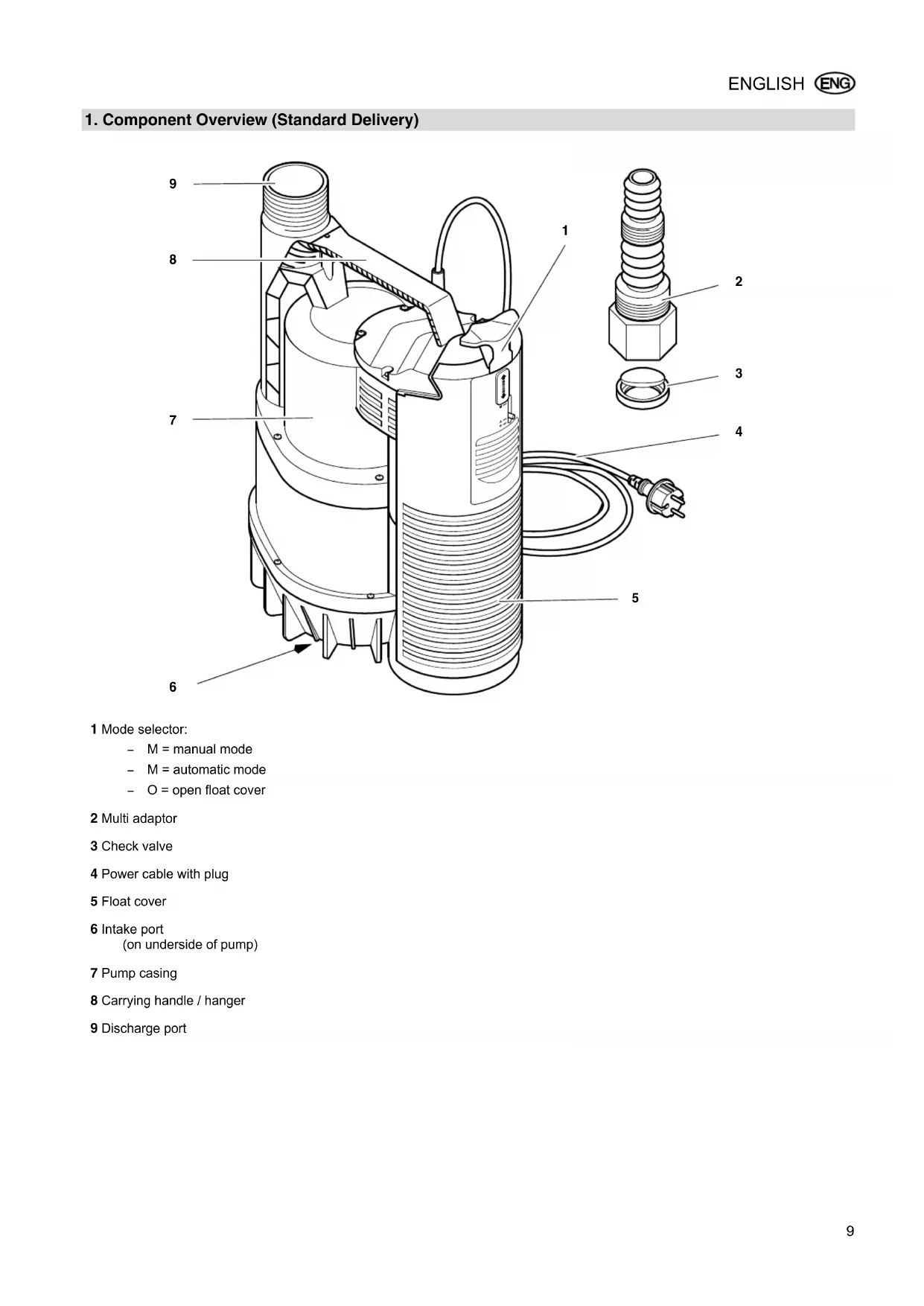 - 1 Mode selector: M = manual mode M = automatic mode O = open float cover 2 Multi adaptor 3 Check valve 4 Power cable with plug 5 Float cover 6 Intake port (on underside of pump) 7 Pump casing 8 Carrying handle / hanger 9 Discharge port XP0024E4.fm Original operating instructions ENGLISH10 ENGLISH 1. Component Overview (Standard Delivery) p. 92