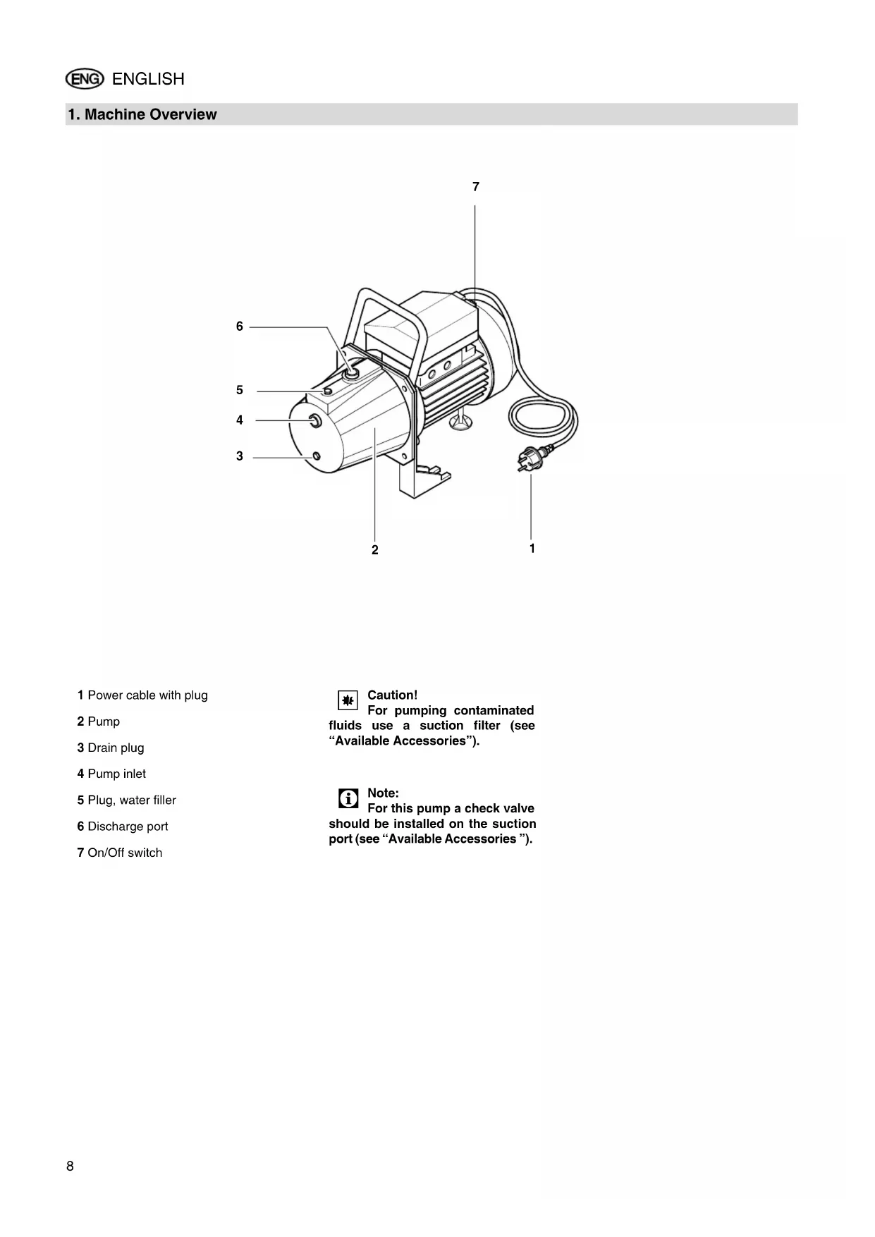 Caution! For pumping contaminated fluids use a suction filter (see “Available Accessories”).