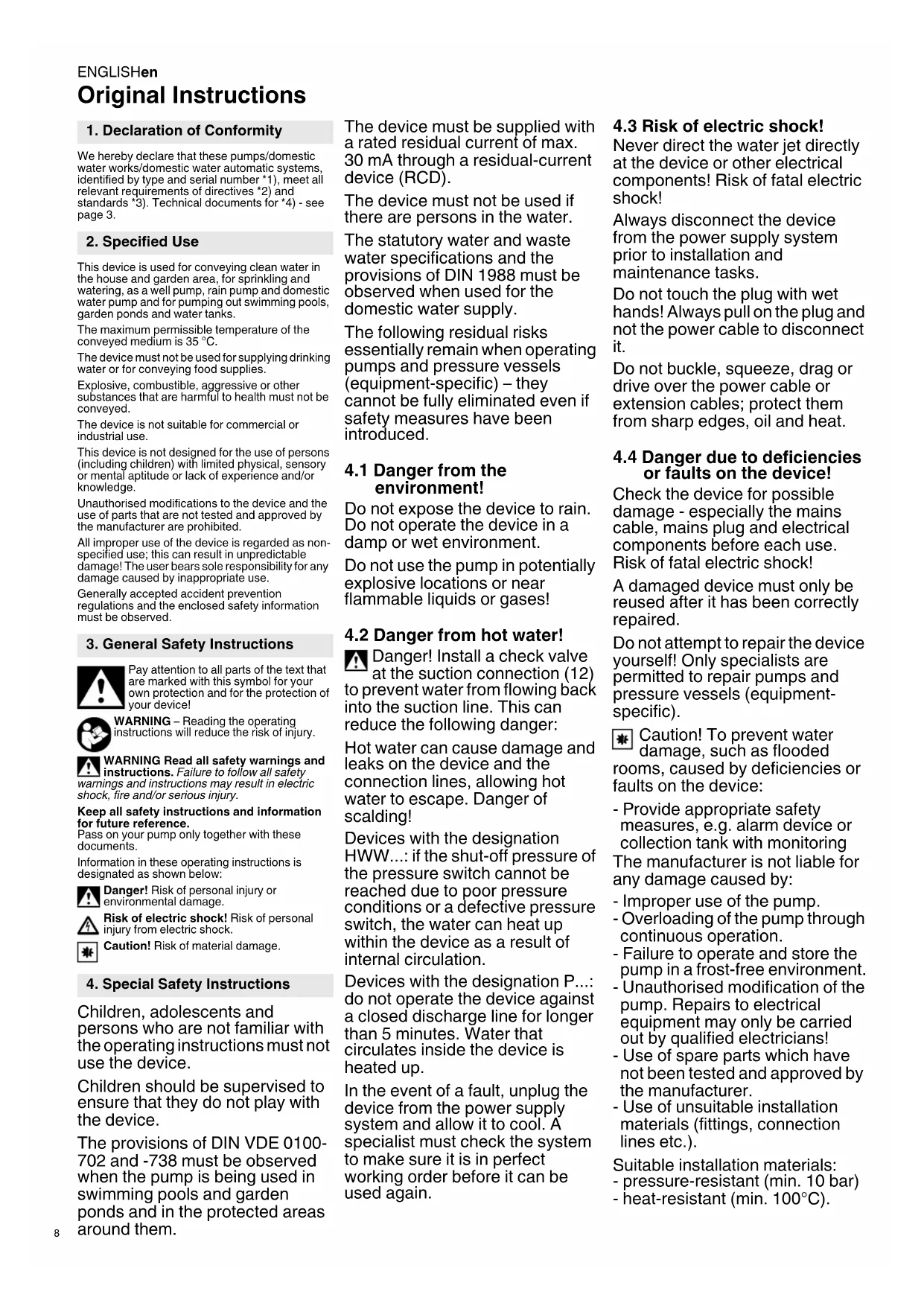 Original Instructions We hereby declare that these pumps/domestic water works/domestic water automatic systems, identified by type and serial number *1), meet all relevant requirements of directives *2) and standards *3). Technical documents for *4) - see page 3. This device is used for conveying clean water in the house and garden area, for sprinkling and watering, as a well pump, rain pump and domestic water pump and for pumping out swimming pools, garden ponds and water tanks. The maximum permissible temperature of the conveyed medium is 35 °C. The device must not be used for supplying drinking water or for conveying food supplies. Explosive, combustible, aggressive or other substances that are harmful to health must not be conveyed. The device is not suitable for commercial or industrial use. This device is not designed for the use of persons (including children) with limited physical, sensory or mental aptitude or lack of experience and/or knowledge. Unauthorised modifications to the device and the use of parts that are not tested and approved by the manufacturer are prohibited. All improper use of the device is regarded as non- specified use; this can result in unpredictable damage! The user bears sole responsibility for any damage caused by inappropriate use. Generally accepted accident prevention regulations and the enclosed safety information must be observed. Pay attention to all parts of the text that are marked with this symbol for your own protection and for the protection of your device! WARNING – Reading the operating instructions will reduce the risk of injury. WARNING Read all safety warnings and instructions. Failure to follow all safety warnings and instructions may result in electric shock, fire and/or serious injury. Keep all safety instructions and information for future reference. Pass on your pump only together with these documents. Information in these operating instructions is designated as shown below: Danger! Risk of personal injury or environmental damage. Risk of electric shock! Risk of personal injury from electric shock. Caution! Risk of material damage. Children, adolescents and persons who are not familiar with the operating instructions must not use the device. Children should be supervised to ensure that they do not play with the device. The provisions of DIN VDE 0100- 702 and -738 must be observed when the pump is being used in swimming pools and garden ponds and in the protected areas around them. The device must be supplied with a rated residual current of max. 30 mA through a residual-current device (RCD). The device must not be used if there are persons in the water. The statutory water and waste water specifications and the provisions of DIN 1988 must be observed when used for the domestic water supply. The following residual risks essentially remain when operating pumps and pressure vessels (equipment-specific) – they cannot be fully eliminated even if safety measures have been introduced.