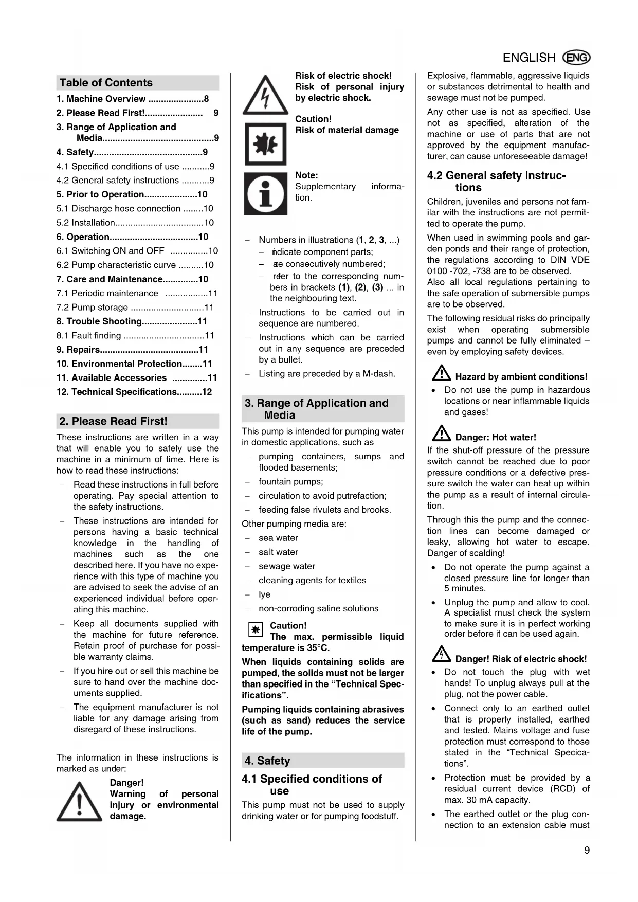tions Children, juveniles and persons not fam- ilar with the instructions are not permit- ted to operate the pump. When used in swimming pools and gar- den ponds and their range of protection, the regulations according to DIN VDE 0100 -702, -738 are to be observed. Also all local regulations pertaining to the safe o peration of submersible pumps are to be observed. The following residual risks do principally exist when operating submersible pumps and cannot be fully eliminated – even by employing safety devices.