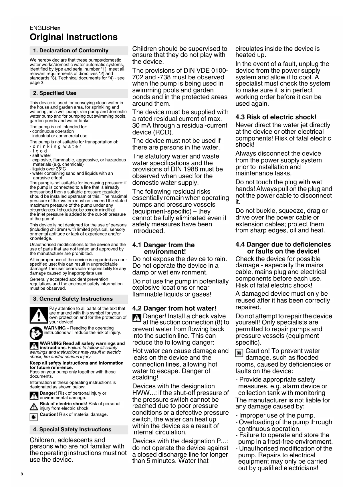 Original Instructions We hereby declare that these pumps/domestic water works/domestic water automatic systems, identified by type and serial number *1), meet all relevant requirements of directives *2) and standards *3). Technical documents for *4) - see page 3. This device is used for conveying clean water in the house and garden area, for sprinkling and watering, as a well pump, rain pump and domestic water pump and for pumping out swimming pools, garden ponds and water tanks. The pump is not intended for: - continuous operation - industrial or commercial use The pump is not suitable for transportation of: -drinking water -food - salt water - explosive, flammable, aggressive, or hazardous materials (e.g. chemicals) - liquids over 35°C - water containing sand and liquids with an abrasive effect The pump is not suitable for increasing pressure: if the pump is connected to a line that is already pressurised then a suitable pressure regulator should be installed upstream of this. The maximal pressure of the system must not exceed the stated maximum pressure of the pump under any circumstances. It should also be borne in mind that the inlet pressure is added to the cut-off pressure of the pump! This device is not designed for the use of persons (including children) with limited physical, sensory or mental aptitude or lack of experience and/or knowledge. Unauthorised modifications to the device and the use of parts that are not tested and approved by the manufacturer are prohibited. All improper use of the device is regarded as non- specified use; this can result in unpredictable damage! The user bears sole responsibility for any damage caused by inappropriate use. Generally accepted accident prevention regulations and the enclosed safety information must be observed. Pay attention to all parts of the text that are marked with this symbol for your own protection and for the protection of your device! WARNING – Reading the operating instructions will reduce the risk of injury. WARNING Read all safety warnings and instructions. Failure to follow all safety warnings and instructions may result in electric shock, fire and/or serious injury. Keep all safety instructions and information for future reference. Pass on your pump only together with these documents. Information in these operating instructions is designated as shown below: Danger! Risk of personal injury or environmental damage. Risk of electric shock! Risk of personal injury from electric shock. Caution! Risk of material damage. Children, adolescents and persons who are not familiar with the operating instructions must not use the device. Children should be supervised to ensure that they do not play with the device. The provisions of DIN VDE 0100- 702 and -738 must be observed when the pump is being used in swimming pools and garden ponds and in the protected areas around them. The device must be supplied with a rated residual current of max. 30 mA through a residual-current device (RCD). The device must not be used if there are persons in the water. The statutory water and waste water specifications and the provisions of DIN 1988 must be observed when used for the domestic water supply. The following residual risks essentially remain when operating pumps and pressure vessels (equipment-specific) – they cannot be fully eliminated even if safety measures have been introduced.