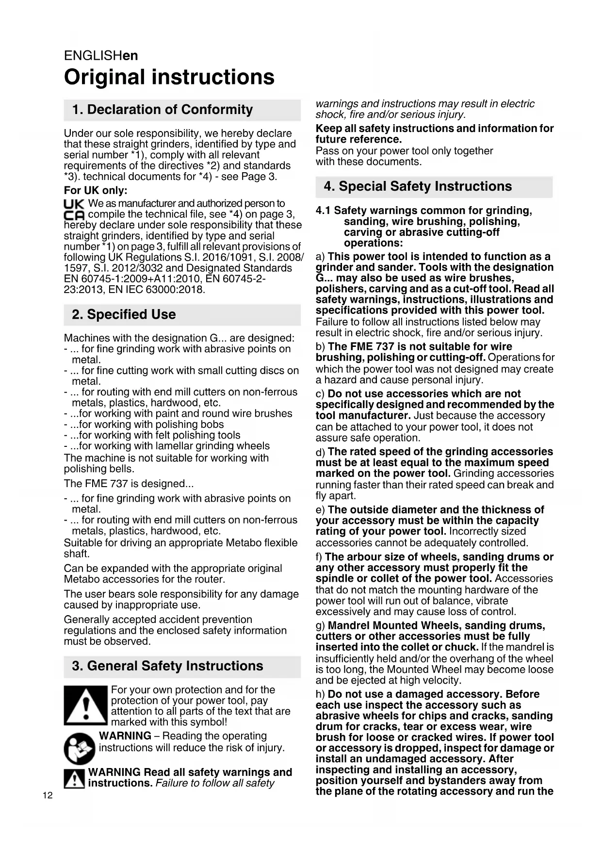 Original instructions Under our sole responsibility, we hereby declare that these straight grinders, identified by type and serial number *1), comply with all relevant requirements of the directives *2) and standards *3). technical documents for *4) - see Page 3. For UK only: We as manufacturer and authorized person to compile the technical file, see *4) on page 3, hereby declare under sole responsibility that these straight grinders, identified by type and serial number *1) on page 3, fulfill all relevant provisions of following UK Regulations S.I. 2016/1091, S.I. 2008/ 1597, S.I. 2012/3032 and Designated Standards EN 60745-1:2009+A11:2010, EN 60745-2- 23:2013, EN IEC 63000:2018. Machines with the designation G... are designed: - ... for fine grinding work with abrasive points on metal. - ... for fine cutting work with small cutting discs on metal. - ... for routing with end mill cutters on non-ferrous metals, plastics, hardwood, etc. - ...for working with paint and round wire brushes - ...for working with polishing bobs - ...for working with felt polishing tools - ...for working with lamellar grinding wheels The machine is not suitable for working with polishing bells. The FME 737 is designed... - ... for fine grinding work with abrasive points on metal. - ... for routing with end mill cutters on non-ferrous metals, plastics, hardwood, etc. Suitable for driving an appropriate Metabo flexible shaft. Can be expanded with the appropriate original Metabo accessories for the router. The user bears sole responsibility for any damage caused by inappropriate use. Generally accepted accident prevention regulations and the enclosed safety information must be observed. For your own protection and for the protection of your power tool, pay attention to all parts of the text that are marked with this symbol! WARNING – Reading the operating instructions will reduce the risk of injury. WARNING Read all safety warnings and instructions. Failure to follow all safety warnings and instructions may result in electric shock, fire and/or serious injury. Keep all safety instructions and information for future reference. Pass on your power tool only together with these documents.