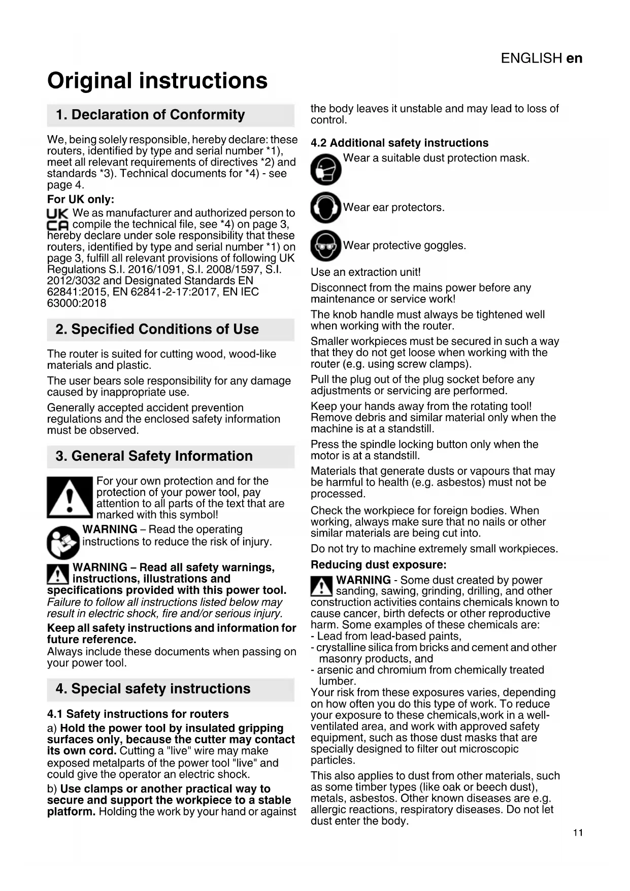 Original instructions We, being solely responsible, hereby declare: these routers, identified by type and serial number *1), meet all relevant requirements of directives *2) and standards *3). Technical documents for *4) - see page 4. For UK only: We as manufacturer and authorized person to compile the technical file, see *4) on page 3, hereby declare under sole responsibility that these routers, identified by type and serial number *1) on page 3, fulfill all relevant provisions of following UK Regulations S.I. 2016/1091, S.I. 2008/1597, S.I. 2012/3032 and Designated Standards EN