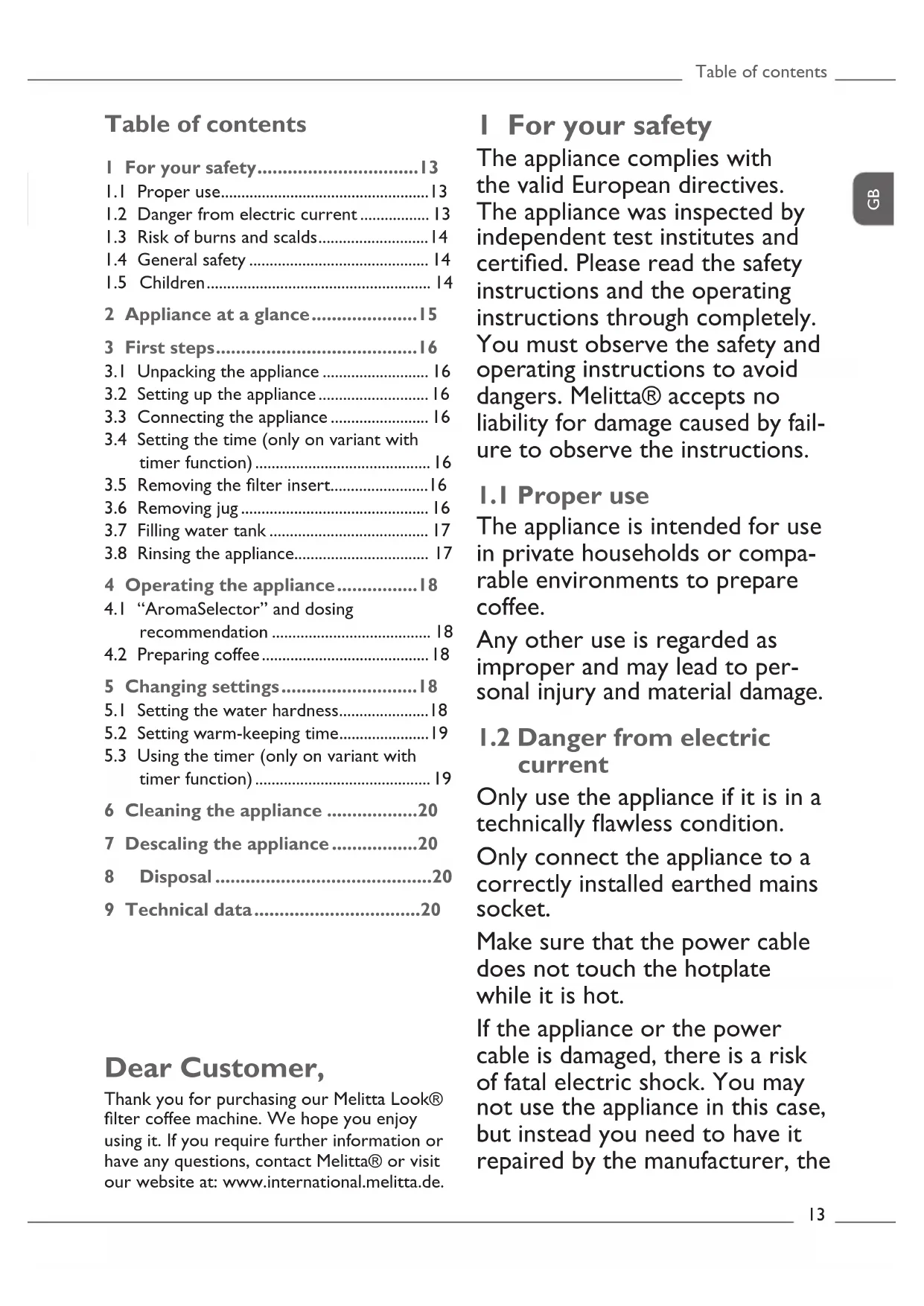 current Only use the appliance if it is in a technically awless condition. Only connect the appliance to a correctly installed earthed mains socket. Make sure that the power cable does not touch the hotplate while it is hot. If the appliance or the power cable is damaged, there is a risk of fatal electric shock. You may not use the appliance in this case, but instead you need to have it repaired by the manufacturer, the Dear Customer, Thank you for purchasing our Melitta Look® lter coffee machine. We hope you enjoy using it. If you require further information or have any questions, contact Melitta® or visit our website at: www.international.melitta.de.For your safety