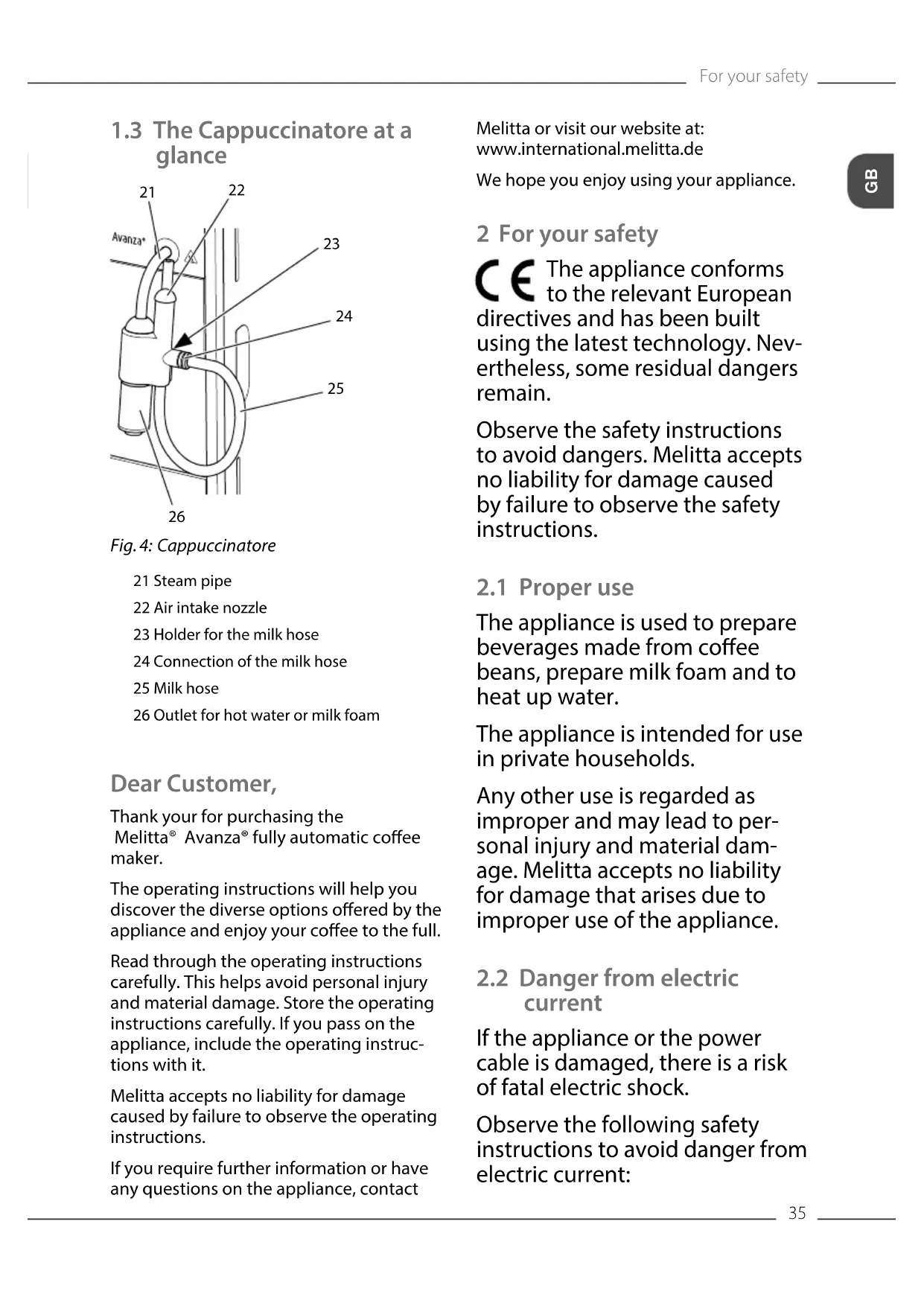 Fig. 4: Cappuccinatore 21 Steam pipe 22 Air intake nozzle 23 Holder for the milk hose 24 Connection of the milk hose 25 Milk hose 26 Outlet for hot water or milk foam Dear Customer, Thank your for purchasing the Melitta® Avanza® fully automatic coee maker. The operating instructions will help you discover the diverse options oered by the appliance and enjoy your coee to the full. Read through the operating instructions carefully. This helps avoid personal injury and material damage. Store the operating instructions carefully. If you pass on the appliance, include the operating instruc- tions with it. Melitta accepts no liability for damage caused by failure to observe the operating instructions. If you require further information or have any questions on the appliance, contact Melitta or visit our website at: www.international.melitta.de We hope you enjoy using your appliance. 2 For your safety The appliance conforms to the relevant European directives and has been built using the latest technology. Nev- ertheless, some residual dangers remain. Observe the safety instructions to avoid dangers. Melitta accepts no liability for damage caused by failure to observe the safety instructions.