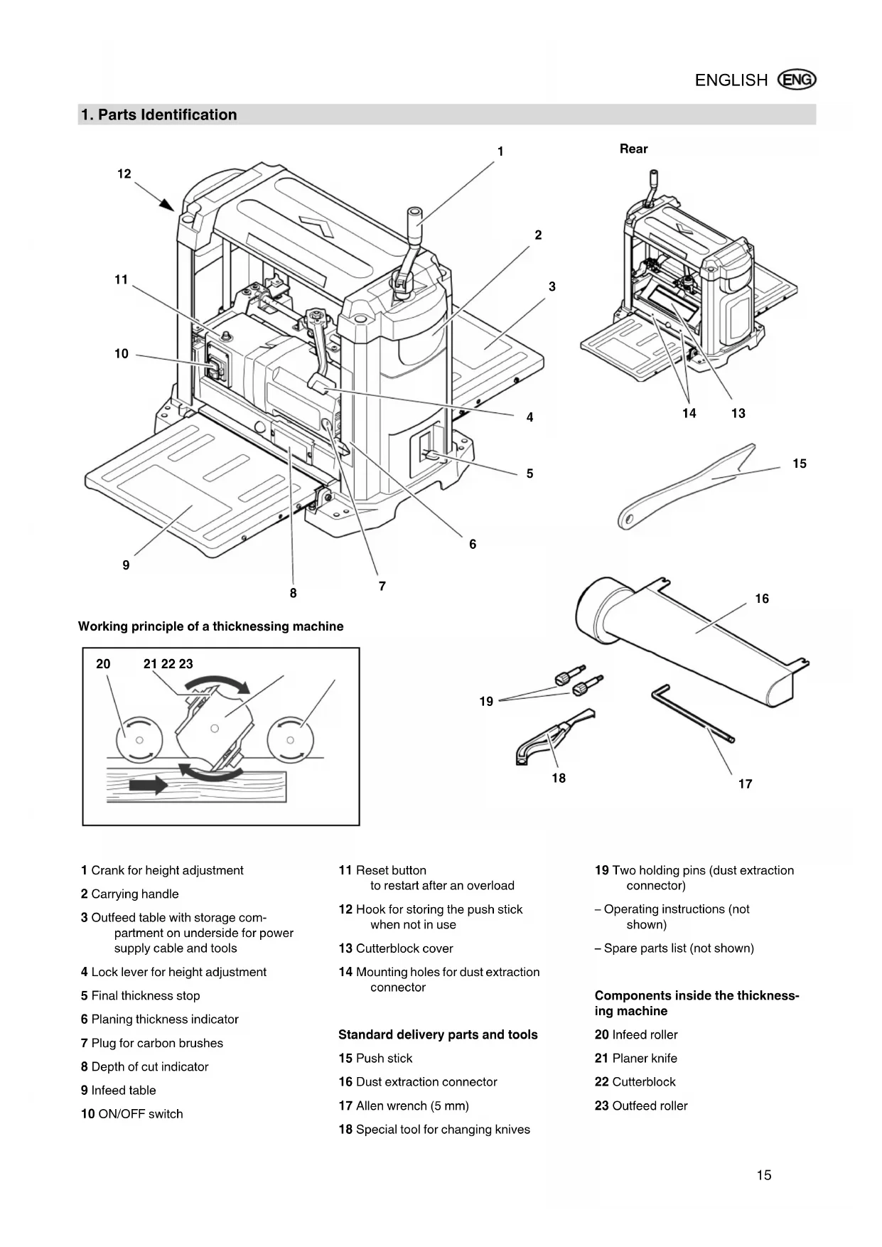 1 Crank for height adjustment 2 Carrying handle 3 Outfeed table with storage com- partment on underside for power supply cable and tools 4 Lock lever for height adjustment 5 Final thickness stop 6 Planing thickness indicator 7 Plug for carbon brushes 8 Depth of cut indicator 9 Infeed table 10 ON/OFF switch 11 Reset button to restart after an overload 12 Hook for storing the push stick when not in use 13 Cutterblock cover 14 Mounting holes for dust extraction connector Standard delivery parts and tools 15 Push stick 16 Dust extraction connector 17 Allen wrench (5 mm) 18 Special tool for changing knives 19 Two holding pins (dust extraction connector) – Operating instructions (not shown) – Spare parts list (not shown) Components inside the thickness- ing machine 20 Infeed roller 21 Planer knife 22 Cutterblock 23 Outfeed roller XW0011E4.fm Original operating instructions ENGLISH16 ENGLISH
