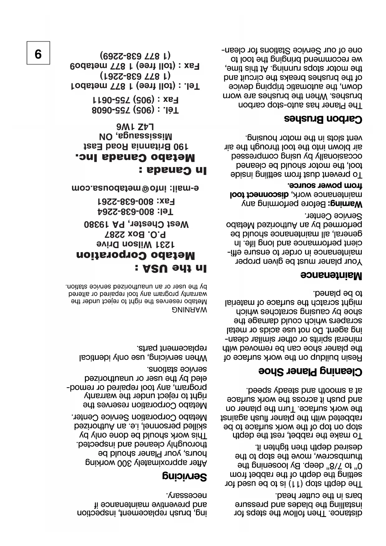 -Ho 0882, F/ES/P_0201 27.08.1956 21:10 Uhr Seite 3031 -Ho 0882, F/ES/P_0201 27.08.1956 21:10 Uhr Seite 319 distance. Then follow the steps for installing the blades and pressure bars in the cutter head. The depth stop (11) is to be used for setting the depth of the rabbet from 0" to 7/8" deep. By loosening the thumbscrew, move the stop to the desired depth then tighten it. To make the rabbet, rest the depth stop on top of the work surface to be rabbeted with the planer flush against the work surface. Turn the planer on and push it across the work surface at a smooth and steady speed. Cleaning Planer Shoe Resin buildup on the work surface of the planer shoe can be removed with mineral spirits or other similar clean- ing agent. Do not use acids or metal scrapers which could damage the shoe by causing scratches which might scratch the surface of material to be planed. Maintenance Your planer must be given proper maintenance in order to ensure effi- cient performance and long life. In general, all maintenance should be performed by an Authorized Metabo Service Center.