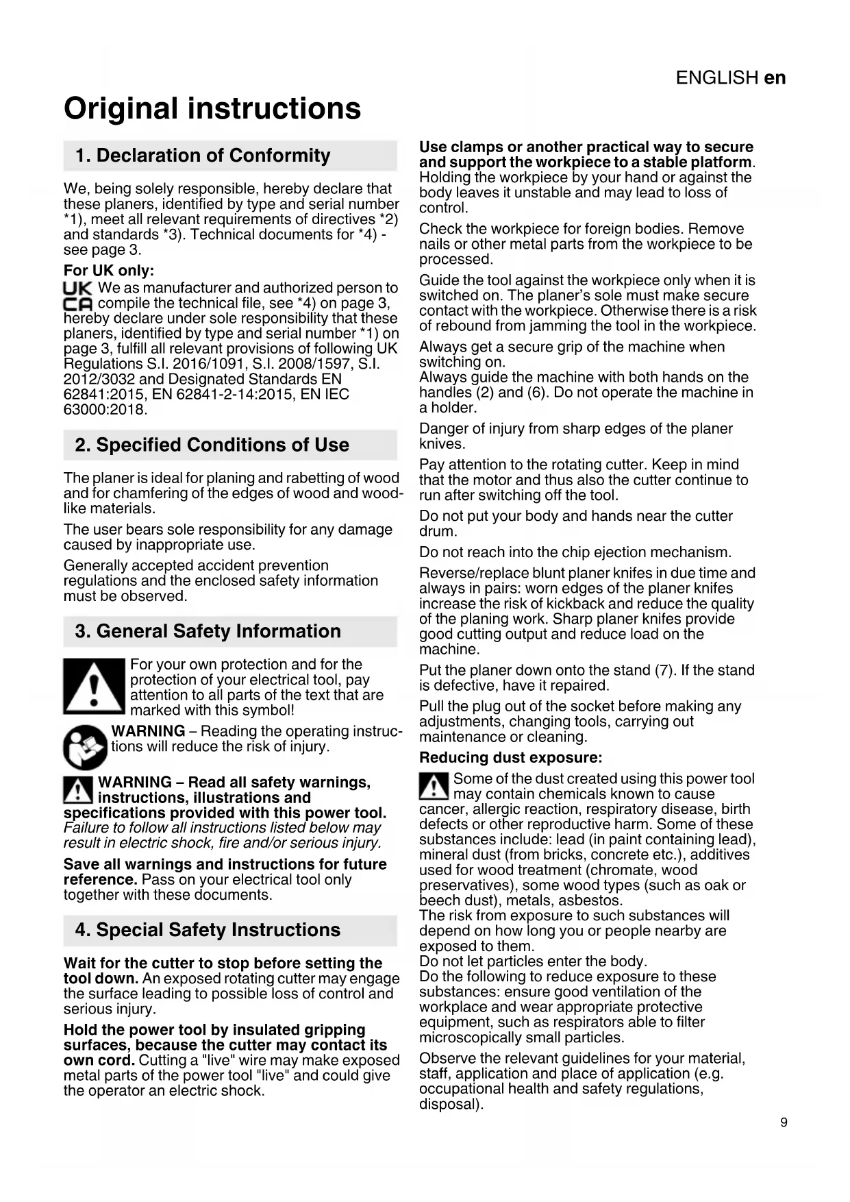 Original instructions We, being solely responsible, hereby declare that these planers, identified by type and serial number *1), meet all relevant requirements of directives *2) and standards *3). Technical documents for *4) - see page 3. For UK only: We as manufacturer and authorized person to compile the technical file, see *4) on page 3, hereby declare under sole responsibility that these planers, identified by type and serial number *1) on page 3, fulfill all relevant provisions of following UK Regulations S.I. 2016/1091, S.I. 2008/1597, S.I. 2012/3032 and Designated Standards EN