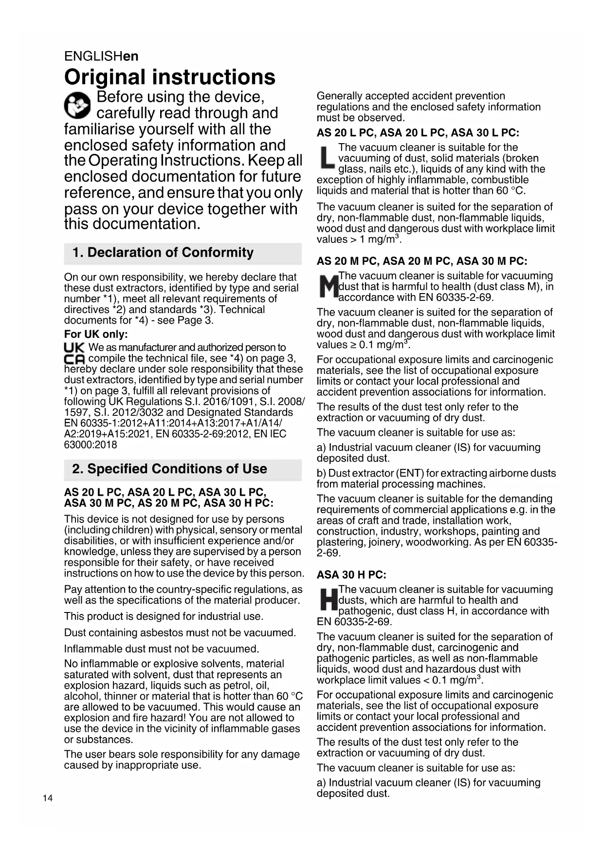 Original instructions Before using the device, carefully read through and familiarise yourself with all the enclosed safety information and the Operating Instructions. Keep all enclosed documentation for future reference, and ensure that you only pass on your device together with this documentation. On our own responsibility, we hereby declare that these dust extractors, identified by type and serial number *1), meet all relevant requirements of directives *2) and standards *3). Technical documents for *4) - see Page 3. For UK only: We as manufacturer and authorized person to compile the technical file, see *4) on page 3, hereby declare under sole responsibility that these dust extractors, identified by type and serial number *1) on page 3, fulfill all relevant provisions of following UK Regulations S.I. 2016/1091, S.I. 2008/ 1597, S.I. 2012/3032 and Designated Standards EN 60335-1:2012+A11:2014+A13:2017+A1/A14/ A2:2019+A15:2021, EN 60335-2-69:2012, EN IEC 63000:2018 AS 20 L PC, ASA 20 L PC, ASA 30 L PC, ASA 30 M PC, AS 20 M PC, ASA 30 H PC: This device is not designed for use by persons (including children) with physical, sensory or mental disabilities, or with insufficient experience and/or knowledge, unless they are supervised by a person responsible for their safety, or have received instructions on how to use the device by this person. Pay attention to the country-specific regulations, as well as the specifications of the material producer. This product is designed for industrial use. Dust containing asbestos must not be vacuumed. Inflammable dust must not be vacuumed. No inflammable or explosive solvents, material saturated with solvent, dust that represents an explosion hazard, liquids such as petrol, oil, alcohol, thinner or material that is hotter than 60 °C are allowed to be vacuumed. This would cause an explosion and fire hazard! You are not allowed to use the device in the vicinity of inflammable gases or substances. The user bears sole responsibility for any damage caused by inappropriate use. Generally accepted accident prevention regulations and the enclosed safety information must be observed. AS 20 L PC, ASA 20 L PC, ASA 30 L PC: The vacuum cleaner is suitable for the vacuuming of dust, solid materials (broken glass, nails etc.), liquids of any kind with the exception of highly inflammable, combustible liquids and material that is hotter than 60 °C. The vacuum cleaner is suited for the separation of dry, non-flammable dust, non-flammable liquids, wood dust and dangerous dust with workplace limit values > 1 mg/m³. AS 20 M PC, ASA 20 M PC, ASA 30 M PC: The vacuum cleaner is suitable for vacuuming dust that is harmful to health (dust class M), in accordance with EN 60335-2-69. The vacuum cleaner is suited for the separation of dry, non-flammable dust, non-flammable liquids, wood dust and dangerous dust with workplace limit values ≥ 0.1 mg/m³. For occupational exposure limits and carcinogenic materials, see the list of occupational exposure limits or contact your local professional and accident prevention associations for information. The results of the dust test only refer to the extraction or vacuuming of dry dust. The vacuum cleaner is suitable for use as: a) Industrial vacuum cleaner (IS) for vacuuming deposited dust. b) Dust extractor (ENT) for extracting airborne dusts from material processing machines. The vacuum cleaner is suitable for the demanding requirements of commercial applications e.g. in the areas of craft and trade, installation work, construction, industry, workshops, painting and plastering, joinery, woodworking. As per EN 60335- 2-69. ASA 30 H PC: The vacuum cleaner is suitable for vacuuming dusts, which are harmful to health and pathogenic, dust class H, in accordance with EN 60335-2-69. The vacuum cleaner is suited for the separation of dry, non-flammable dust, carcinogenic and pathogenic particles, as well as non-flammable liquids, wood dust and hazardous dust with workplace limit values < 0.1 mg/m³. For occupational exposure limits and carcinogenic materials, see the list of occupational exposure limits or contact your local professional and accident prevention associations for information. The results of the dust test only refer to the extraction or vacuuming of dry dust. The vacuum cleaner is suitable for use as: a) Industrial vacuum cleaner (IS) for vacuuming deposited dust.