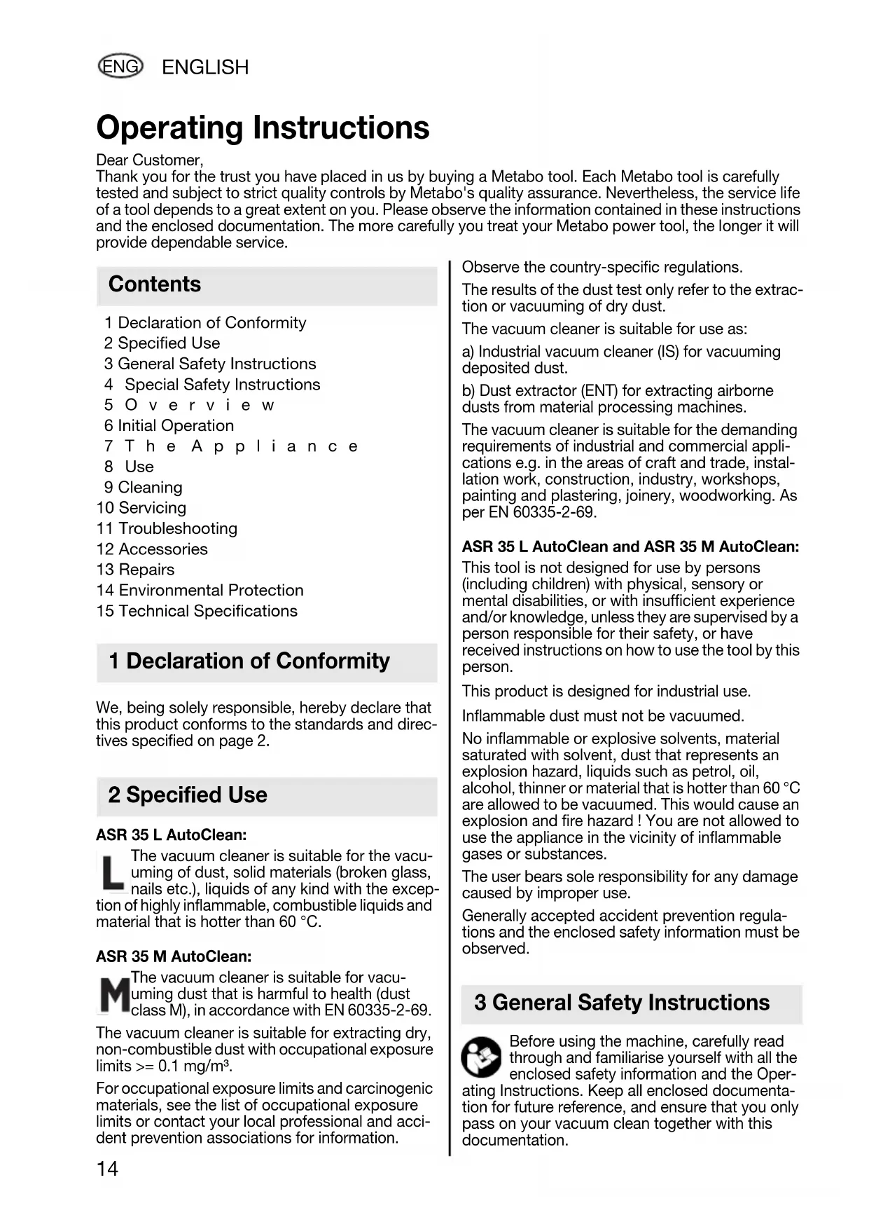 = Schallleistungspegel Beim Arbeiten kann der Geräuschpegel 80 dB(A) überschreiten. Gehörschutz tragen! Messwerte ermittelt gemäß EN 60704. ~ Wechselstrom Die angegebenen technischen Daten sind toleranzbehaftet (entsprechend den jeweils gültigen Standards). 17027067_0711 ASR 35 L_M AutoClean ENTWURF.book Seite 13 Montag, 25. Juli 2011 4:46 1614 ENGLISH ENG 1 Declaration of Conformity 2 Specified Use 3 General Safety Instructions 4 Special Safety Instructions 5Overview 6 Initial Operation 7The Appliance 8Use 9 Cleaning 10 Servicing 11 Troubleshooting 12 Accessories 13 Repairs 14 Environmental Protection 15 Technical Specifications We, being solely responsible, hereby declare that this product conforms to the standards and direc- tives specified on page 2. ASR 35 L AutoClean: The vacuum cleaner is suitable for the vacu- uming of dust, solid materials (broken glass, nails etc.), liquids of any kind with the excep- tion of highly inflammable, combustible liquids and material that is hotter than 60 °C. ASR 35 M AutoClean: The vacuum cleaner is suitable for vacu- uming dust that is harmful to health (dust class M), in accordance with EN 60335-2-69. The vacuum cleaner is suitable for extracting dry, non-combustible dust with occupational exposure limits >= 0.1 mg/m³. For occupational exposure limits and carcinogenic materials, see the list of occupational exposure limits or contact your local professional and acci- dent prevention associations for information. Observe the country-specific regulations. The results of the dust test only refer to the extrac- tion or vacuuming of dry dust. The vacuum cleaner is suitable for use as: a) Industrial vacuum cleaner (IS) for vacuuming deposited dust. b) Dust extractor (ENT) for extracting airborne dusts from material processing machines. The vacuum cleaner is suitable for the demanding requirements of industrial and commercial appli- cations e.g. in the areas of craft and trade, instal- lation work, construction, industry, workshops, painting and plastering, joinery, woodworking. As per EN 60335-2-69. ASR 35 L AutoClean and ASR 35 M AutoClean: This tool is not designed for use by persons (including children) with physical, sensory or mental disabilities, or with insufficient experience and/or knowledge, unless they are supervised by a person responsible for their safety, or have received instructions on how to use the tool by this person. This product is designed for industrial use. Inflammable dust must not be vacuumed. No inflammable or explosive solvents, material saturated with solvent, dust that represents an explosion hazard, liquids such as petrol, oil, alcohol, thinner or material that is hotter than 60 °C are allowed to be vacuumed. This would cause an explosion and fire hazard ! You are not allowed to use the appliance in the vicinity of inflammable gases or substances. The user bears sole responsibility for any damage caused by improper use. Generally accepted accident prevention regula- tions and the enclosed safety information must be observed. Before using the machine, carefully read through and familiarise yourself with all the enclosed safety information and the Oper- ating Instructions. Keep all enclosed documenta- tion for future reference, and ensure that you only pass on your vacuum clean together with this documentation. Operating Instructions Dear Customer, Thank you for the trust you have placed in us by buying a Metabo tool. Each Metabo tool is carefully tested and subject to strict quality controls by Metabo's quality assurance. Nevertheless, the service life of a tool depends to a great extent on you. Please observe the information contained in these instructions and the enclosed documentation. The more carefully you treat your Metabo power tool, the longer it will provide dependable service. Contents 1 Declaration of Conformity 2 Specified Use 3 General Safety Instructions 17027067_0711 ASR 35 L_M AutoClean ENTWURF.book Seite 14 Montag, 25. Juli 2011 4:46 16ENGLISH