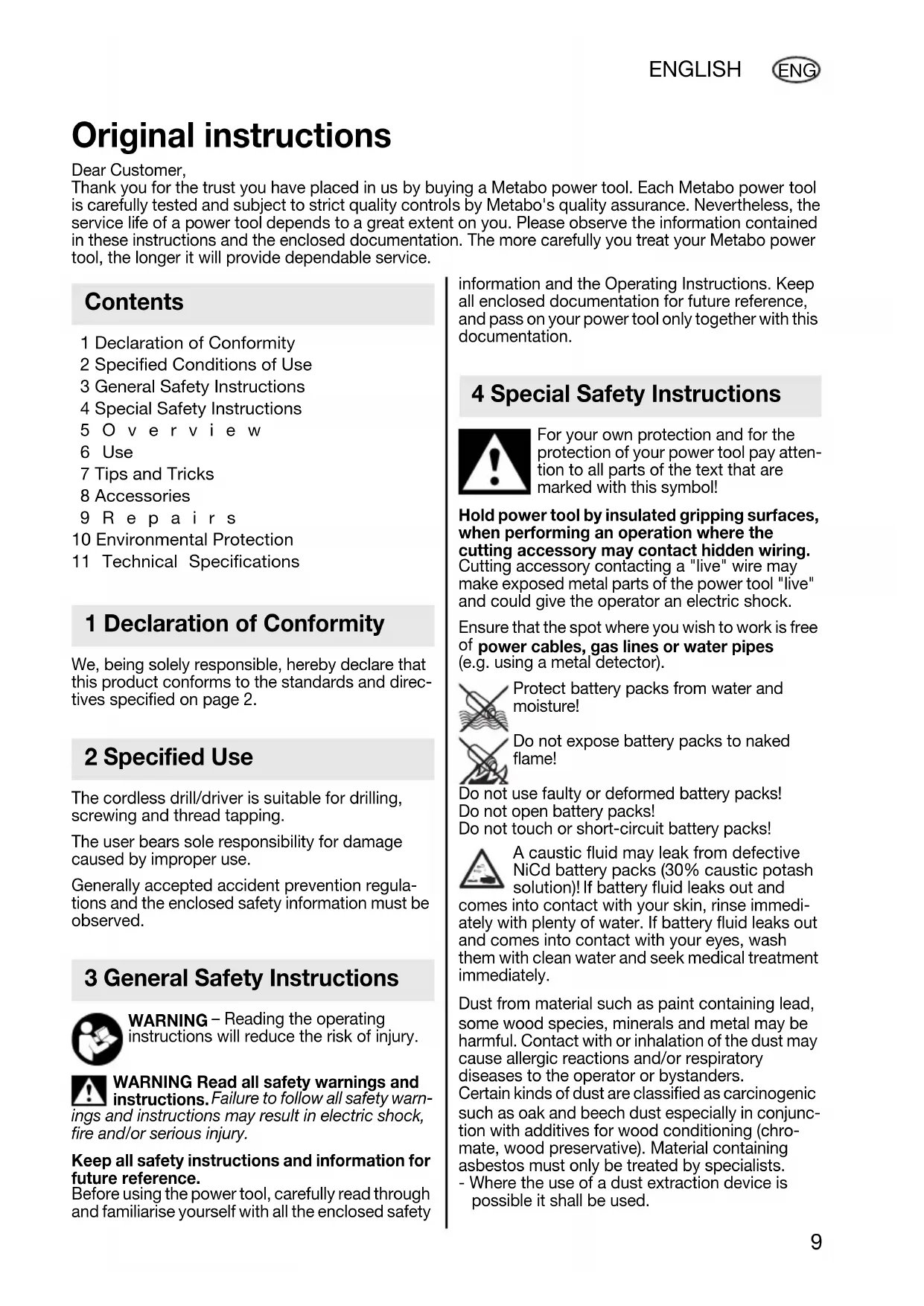 power cables, gas lines or water pipes (e.g. using a metal detector). Protect battery packs from water and moisture! Do not expose battery packs to naked flame! Do not use faulty or deformed battery packs! Do not open battery packs! Do not touch or short-circuit battery packs! A caustic fluid may leak from defective NiCd battery packs (30% caustic potash solution)! If battery fluid leaks out and comes into contact with your skin, rinse immedi- ately with plenty of water. If battery fluid leaks out and comes into contact with your eyes, wash them with clean water and seek medical treatment immediately. Dust from material such as paint containing lead, some wood species, minerals and metal may be harmful. Contact with or inhalation of the dust may cause allergic reactions and/or respiratory diseases to the operator or bystanders. Certain kinds of dust are classified as carcinogenic such as oak and beech dust especially in conjunc- tion with additives for wood conditioning (chro- mate, wood preservative). Material containing asbestos must only be treated by specialists. - Where the use of a dust extraction device is possible it shall be used. Original instructions Dear Customer, Thank you for the trust you have placed in us by buying a Metabo power tool. Each Metabo power tool is carefully tested and subject to strict quality controls by Metabo's quality assurance. Nevertheless, the service life of a power tool depends to a great extent on you. Please observe the information contained in these instructions and the enclosed documentation. The more carefully you treat your Metabo power tool, the longer it will provide dependable service. Contents 1 Declaration of Conformity 2 Specified Use 3 General Safety Instructions 4 Special Safety Instructions 17026985_1010 BS 12 NiCd.book Seite 9 Mittwoch, 13. Oktober 2010 8:31 0810 ENGLISH ENG - The work place must be well ventilated. - The use of a dust mask of filter class P2 is recommended. Follow national requirements for the materials you want to work with. Secure the workpiece against slipping, e.g. with the help of clamping devices. LED (7): Do not view LEDs directly through optical instruments, LED class 1M, classified as per DIN EN 60825-1: 2003, wavelength: 400-780 nm; 5 lm. See page 3 (please unfold).