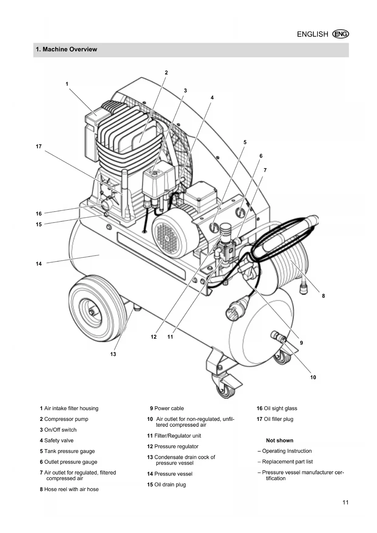 1 Air intake filter housing 2 Compressor pump 3 On/Off switch 4 Safety valve 5 Tank pressure gauge 6 Outlet pressure gauge 7 Air outlet for regulated, filtered compressed air 8 Hose reel with air hose 9 Power cable 10 Air outlet for non-regulated, unfil- tered compressed air 11 Filter/Regulator unit 12 Pressure regulator 13 Condensate drain cock of pressure vessel 14 Pressure vessel 15 Oil drain plug 16 Oil sight glass 17 Oil filler plug Not shown – Operating Instruction – Replacement part list – Pressure vessel manufacturer cer- tification Xk0017e2.fm Operating Instruction ENGLISH12 ENGLISH