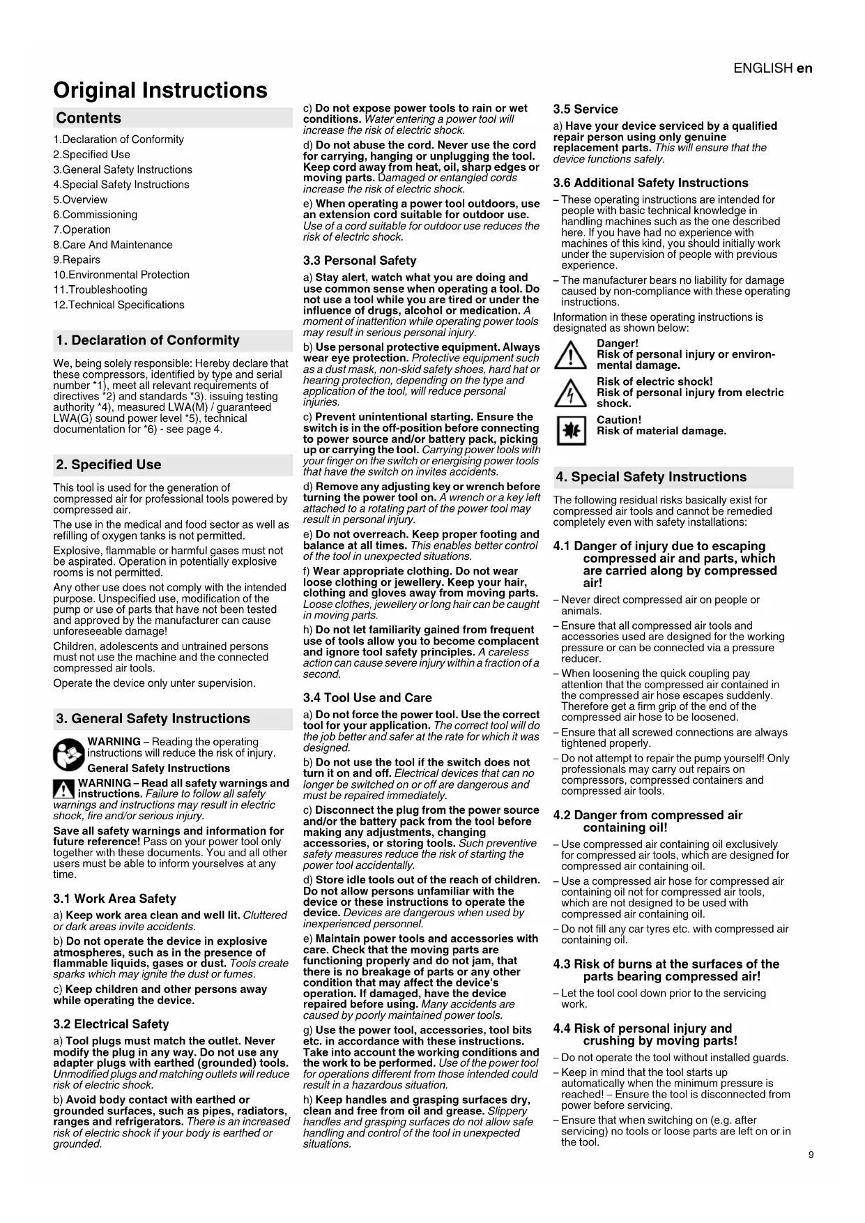 Original Instructions 1.Declaration of Conformity 2.Specified Use 3.General Safety Instructions 4.Special Safety Instructions 5.Overview 6.Commissioning 7.Operation 8.Care And Maintenance 9.Repairs 10.Environmental Protection 11.Troubleshooting 12.Technical Specifications We, being solely responsible: Hereby declare that these compressors, identified by type and serial number *1), meet all relevant requirements of directives *2) and standards *3). issuing testing authority *4), measured LWA(M) / guaranteed LWA(G) sound power level *5), technical documentation for *6) - see page 4. This tool is used for the generation of compressed air for professional tools powered by compressed air. The use in the medical and food sector as well as refilling of oxygen tanks is not permitted. Explosive, flammable or harmful gases must not be aspirated. Operation in potentially explosive rooms is not permitted. Any other use does not comply with the intended purpose. Unspecified use, modification of the pump or use of parts that have not been tested and approved by the manufacturer can cause unforeseeable damage! Children, adolescents and untrained persons must not use the machine and the connected compressed air tools. Operate the device only unter supervision. WARNING – Reading the operating instructions will reduce the risk of injury. General Safety Instructions WARNING – Read all safety warnings and instructions. Failure to follow all safety warnings and instructions may result in electric shock, fire and/or serious injury. Save all safety warnings and information for future reference! Pass on your power tool only together with these documents. You and all other users must be able to inform yourselves at any time.