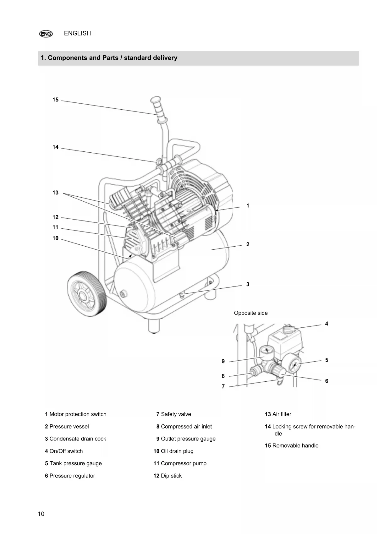 Opposite side 1 Motor protection switch 2 Pressure vessel 3 Condensate drain cock 4 On/Off switch 5 Tank pressure gauge 6 Pressure regulator 7 Safety valve 8 Compressed air inlet 9 Outlet pressure gauge 10 Oil drain plug 11 Compressor pump 12 Dip stick 13 Air filter 14 Locking screw for removable han- dle 15 Removable handle I_0021en1A.fm 10.3.10 Original operating instructionsENGLISH