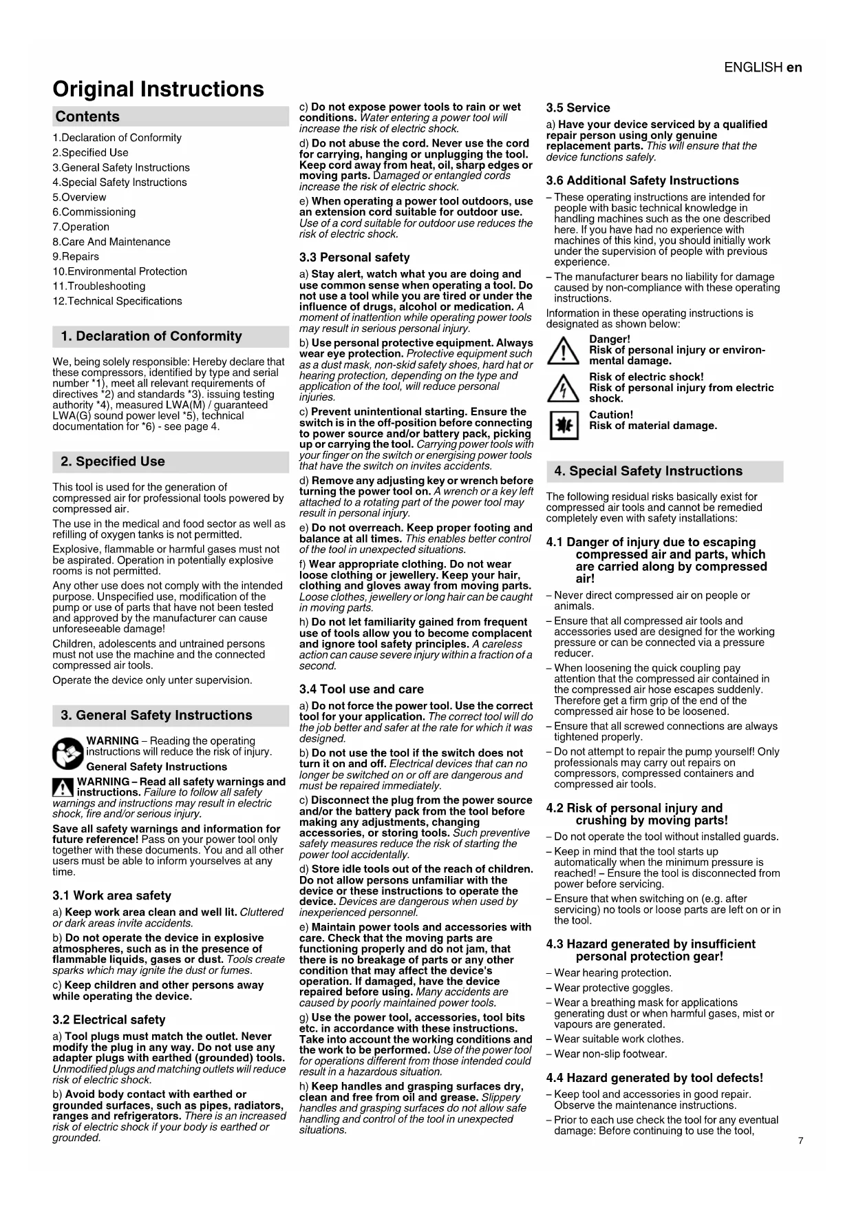 Original Instructions 1.Declaration of Conformity 2.Specified Use 3.General Safety Instructions 4.Special Safety Instructions 5.Overview 6.Commissioning 7.Operation 8.Care And Maintenance 9.Repairs 10.Environmental Protection 11.Troubleshooting 12.Technical Specifications We, being solely responsible: Hereby declare that these compressors, identified by type and serial number *1), meet all relevant requirements of directives *2) and standards *3). issuing testing authority *4), measured LWA(M) / guaranteed LWA(G) sound power level *5), technical documentation for *6) - see page 4. This tool is used for the generation of compressed air for professional tools powered by compressed air. The use in the medical and food sector as well as refilling of oxygen tanks is not permitted. Explosive, flammable or harmful gases must not be aspirated. Operation in potentially explosive rooms is not permitted. Any other use does not comply with the intended purpose. Unspecified use, modification of the pump or use of parts that have not been tested and approved by the manufacturer can cause unforeseeable damage! Children, adolescents and untrained persons must not use the machine and the connected compressed air tools. Operate the device only unter supervision. WARNING – Reading the operating instructions will reduce the risk of injury. General Safety Instructions WARNING – Read all safety warnings and instructions. Failure to follow all safety warnings and instructions may result in electric shock, fire and/or serious injury. Save all safety warnings and information for future reference! Pass on your power tool only together with these documents. You and all other users must be able to inform yourselves at any time.