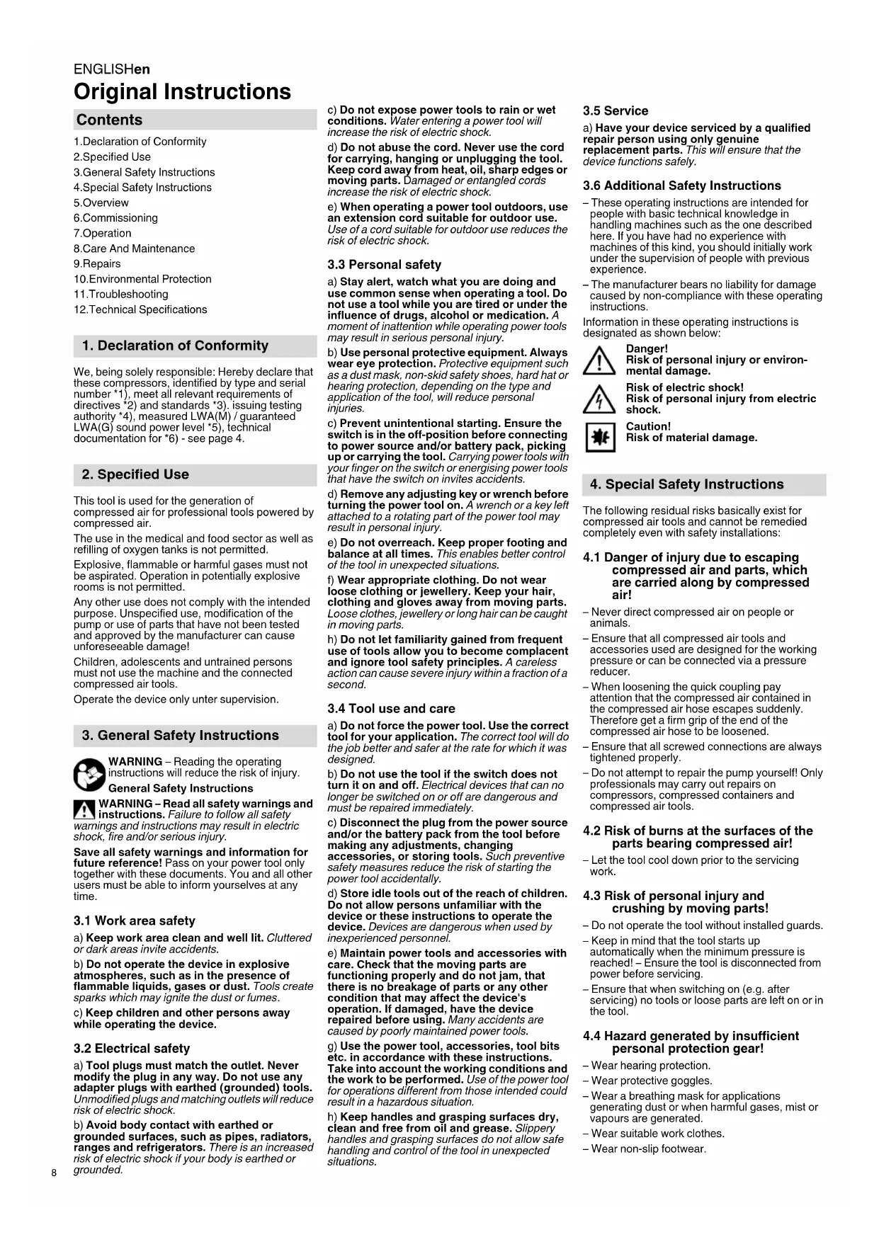 Original Instructions 1.Declaration of Conformity 2.Specified Use 3.General Safety Instructions 4.Special Safety Instructions 5.Overview 6.Commissioning 7.Operation 8.Care And Maintenance 9.Repairs 10.Environmental Protection 11.Troubleshooting 12.Technical Specifications We, being solely responsible: Hereby declare that these compressors, identified by type and serial number *1), meet all relevant requirements of directives *2) and standards *3). issuing testing authority *4), measured LWA(M) / guaranteed LWA(G) sound power level *5), technical documentation for *6) - see page 4. This tool is used for the generation of compressed air for professional tools powered by compressed air. The use in the medical and food sector as well as refilling of oxygen tanks is not permitted. Explosive, flammable or harmful gases must not be aspirated. Operation in potentially explosive rooms is not permitted. Any other use does not comply with the intended purpose. Unspecified use, modification of the pump or use of parts that have not been tested and approved by the manufacturer can cause unforeseeable damage! Children, adolescents and untrained persons must not use the machine and the connected compressed air tools. Operate the device only unter supervision. WARNING – Reading the operating instructions will reduce the risk of injury. General Safety Instructions WARNING – Read all safety warnings and instructions. Failure to follow all safety warnings and instructions may result in electric shock, fire and/or serious injury. Save all safety warnings and information for future reference! Pass on your power tool only together with these documents. You and all other users must be able to inform yourselves at any time.