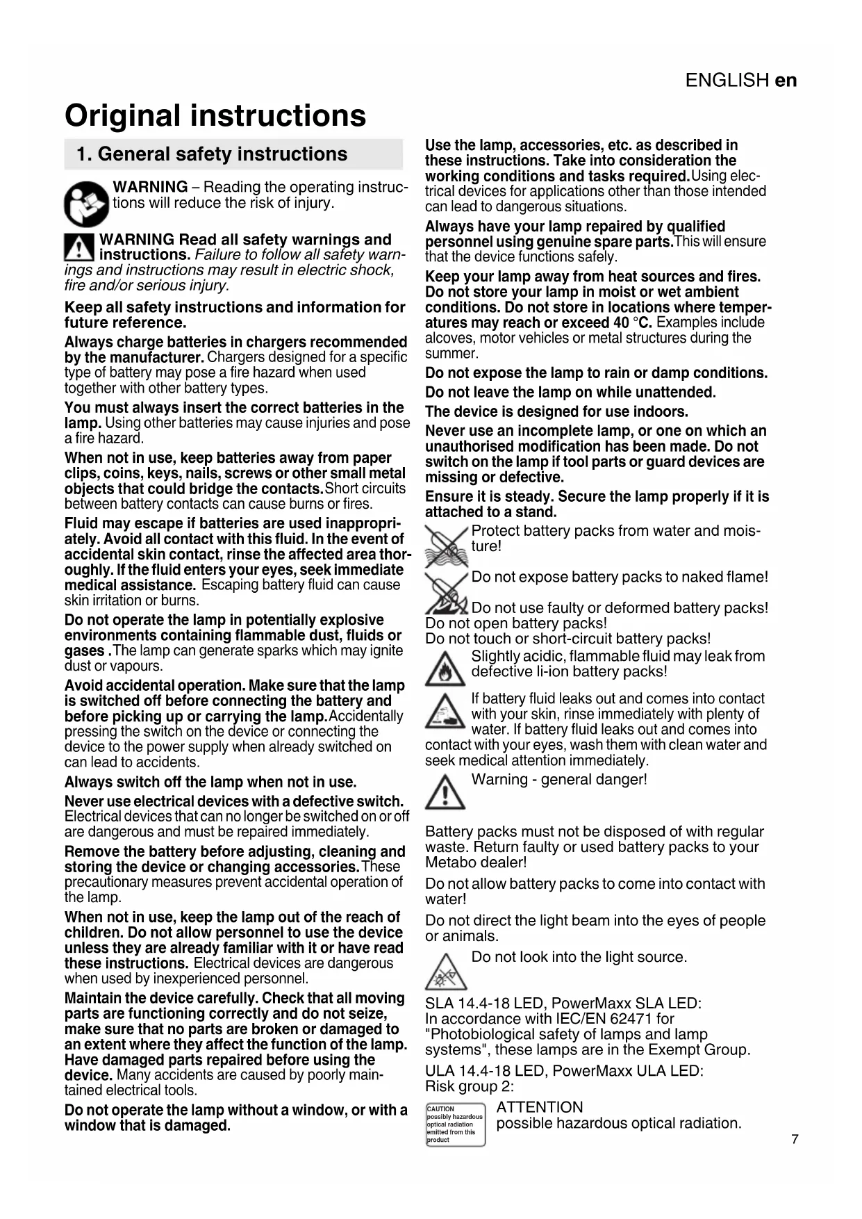 WARNING – Reading the operating instruc- tions will reduce the risk of injury. WARNING Read all safety warnings and instructions. Failure to follow all safety warn- ings and instructions may result in electric shock, fire and/or serious injury. Keep all safety instructions and information for future reference. Always charge batteries in chargers recommended by the manufacturer. Chargers designed for a specific type of battery may pose a fire hazard when used together with other battery types. You must always insert the correct batteries in the lamp. Using other batteries may cause injuries and pose a fire hazard. When not in use, keep batteries away from paper clips, coins, keys, nails, screws or other small metal objects that could bridge the contacts. Short circuits between battery contacts can cause burns or fires. Fluid may escape if batteries are used inappropri- ately. Avoid all contact with this fluid. In the event of accidental skin contact, rinse the affected area thor- oughly. If the fluid enters your eyes, seek immediate medical assistance. Escaping battery fluid can cause skin irritation or burns. Do not operate the lamp in potentially explosive environments containing flammable dust, fluids or gases . The lamp can generate sparks which may ignite dust or vapours. Avoid accidental operation. Make sure that the lamp is switched off before connecting the battery and before picking up or carrying the lamp. Accidentally pressing the switch on the device or connecting the device to the power supply when already switched on can lead to accidents. Always switch off the lamp when not in use. Never use electrical devices with a defective switch. Electrical devices that can no longer be switched on or off are dangerous and must be repaired immediately. Remove the battery before adjusting, cleaning and storing the device or changing accessories. These precautionary measures prevent accidental operation of the lamp. When not in use, keep the lamp out of the reach of children. Do not allow personnel to use the device unless they are already familiar with it or have read these instructions. Electrical devices are dangerous when used by inexperienced personnel. Maintain the device carefully. Check that all moving parts are functioning correctly and do not seize, make sure that no parts are broken or damaged to an extent where they affect the function of the lamp. Have damaged parts repaired before using the device. Many accidents are caused by poorly main- tained electrical tools. Do not operate the lamp without a window, or with a window that is damaged. Use the lamp, accessories, etc. as described in these instructions. Take into consideration the working conditions and tasks required. Using elec- trical devices for applications other than those intended can lead to dangerous situations. Always have your lamp repaired by qualified personnel using genuine spare parts. This will ensure that the device functions safely. Keep your lamp away from heat sources and fires. Do not store your lamp in moist or wet ambient conditions. Do not store in locations where temper- atures may reach or exceed 40 °C. Examples include alcoves, motor vehicles or metal structures during the summer. Do not expose the lamp to rain or damp conditions. Do not leave the lamp on while unattended. The device is designed for use indoors. Never use an incomplete lamp, or one on which an unauthorised modification has been made. Do not switch on the lamp if tool parts or guard devices are missing or defective. Ensure it is steady. Secure the lamp properly if it is attached to a stand. Protect battery packs from water and mois- ture! Do not expose battery packs to naked flame! Do not use faulty or deformed battery packs! Do not open battery packs! Do not touch or short-circuit battery packs! Slightly acidic, flammable fluid may leak from defective li-ion battery packs! If battery fluid leaks out and comes into contact with your skin, rinse immediately with plenty of water. If battery fluid leaks out and comes into contact with your eyes, wash them with clean water and seek medical attention immediately. Warning - general danger! Battery packs must not be disposed of with regular waste. Return faulty or used battery packs to your Metabo dealer! Do not allow battery packs to come into contact with water! Do not direct the light beam into the eyes of people or animals. Do not look into the light source. SLA 14.4-18 LED, PowerMaxx SLA LED: In accordance with IEC/EN 62471 for "Photobiological safety of lamps and lamp systems", these lamps are in the Exempt Group. ULA 14.4-18 LED, PowerMaxx ULA LED: Risk group 2: ATTENTION possible hazardous optical radiation. Original instructions