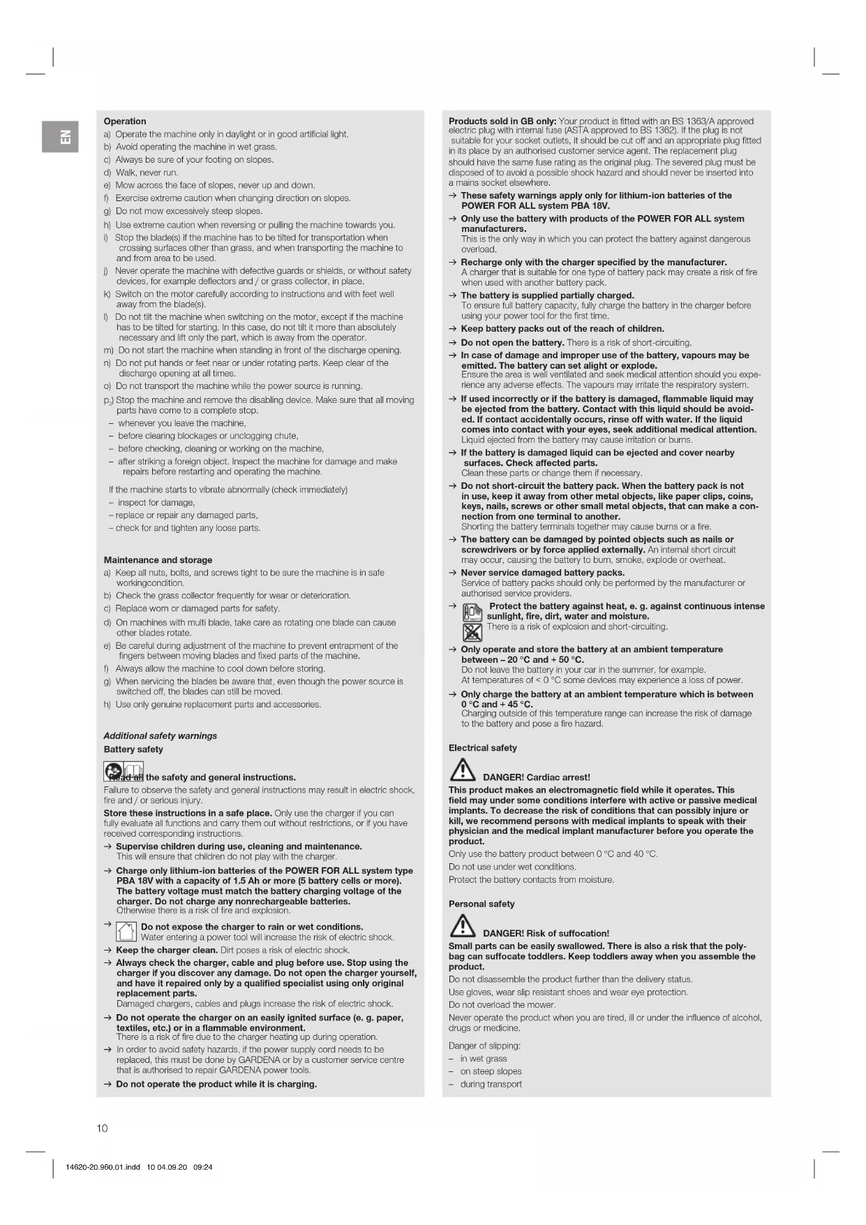 Protect the battery against heat, e. g. against continuous intense sunlight, fire, dirt, water and moisture. There is a risk of explosion and short-circuiting. v Only operate and store the battery at an ambient temperature between – 20 °C and + 50 °C. Do not leave the battery in your car in the summer, for example. At temperatures of < 0 °C some devices may experience a loss of power. v Only charge the battery at an ambient temperature which is between 0°C and + 45 °C. Charging outside of this temperature range can increase the risk of damage tothe battery and pose a fire hazard. Electrical safety DANGER! Cardiac arrest! This product makes an electromagnetic field while it operates. This field may under some conditions interfere with active or passive medical implants. To decrease the risk of conditions that can possibly injure or kill, we recommend persons with medical implants to speak with their physician and the medical implant manufacturer before you operate the product. Only use the battery product between 0 °C and 40 °C. Do not use under wet conditions. Protect the battery contacts from moisture. Personal safety DANGER! Risk of suffocation! Small parts can be easily swallowed. There is also a risk that the poly- bagcan suffocate toddlers. Keep toddlers away when you assemble the product. Do not disassemble the product further than the delivery status. Use gloves, wear slip resistant shoes and wear eye protection. Do not overload the mower. Never operate the product when you are tired, ill or under the influence of alcohol, drugs or medicine. Danger of slipping: – in wet grass – on steep slopes – during transport