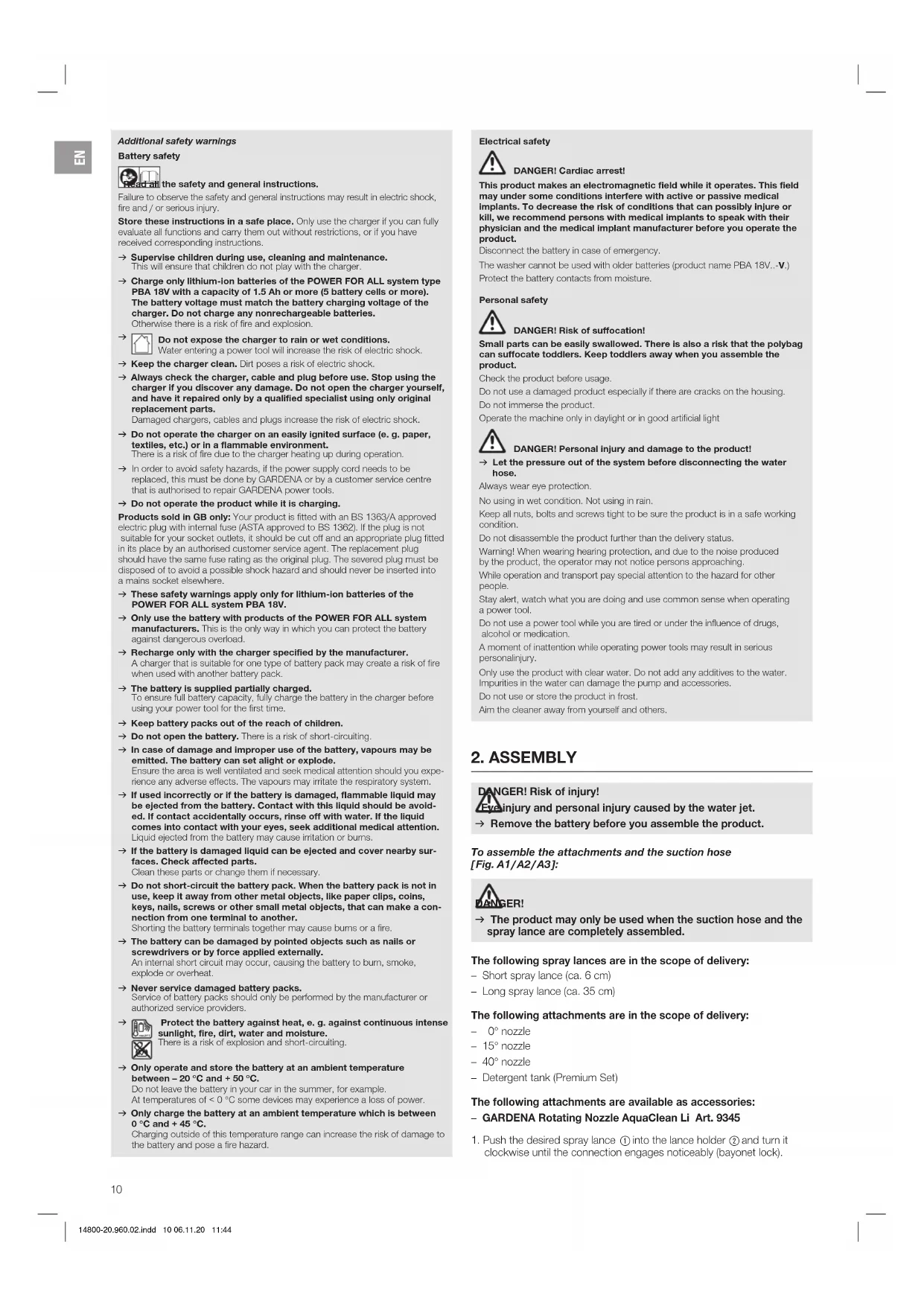 Translation of the original instructions. This product must not be used by children. Children must be supervised to ensure that they do not play with the product. This product may be used by persons with reduced physical, sensory or mental abilities or lack of experience and knowledge if they have been supervised or instructed in the safe use of the product and understand the hazards involved. Intended use: The GARDENA Battery Medium Pressure Washer is intended to clean floor tiles, garden furniture / tools, bicycles, vehicles, boats and to clean softly in private domestic gardens and allotments. The product is not intended for continuous operation. DANGER! Risk of physical injury! v Do not use the product for cleaning people, animals or electrical wiring. Scope of delivery of the sets: Art. 14800-20 Premium Set Art. 14800-31 Art. 14800-55 Washer x x x Battery x x – Charger x x – 3 Nozzles x x x Hose x x x Water bag – x – Detergent tank – x – IMPORTANT! Read the operator’s manual carefully before use and keep for future reference. Symbols on the product: Read operator’s manual. The product is not suitable for connection to the drinking water supply system. For the charger: Remove plug from the mains immediately if the cable is damaged or cut. General safety warnings Electrical safety DANGER! Electric shock! Risk of injury due to electric shock. v The product must be supplied through a residual current device (RCD) having a rated residual operating current not exceeding 30 mA. It must be observed that no liquid may be directed directly at electrical devices and equipment containing electrical components, e.g. the interior of ovens. Safe operating practices Due to physical hazards, only the liquid agents specified by the manufacturer may be applied with the product. No acids, disinfectants and impregnating agents, aggressive cleaning agents containing solvents, petrol or spray oil may be applied. The water temperature must not exceed 45 °C. When connecting the medium pressure washer to the water supply system, the country-specific sanitary regulations must be observed to prevent water not of drinking water quality being drawn back in. v Please consult a specialist for sanitary installations. Always wear approved eye and ear protection. Wear suitable personal protective equipment (safety gloves). The maximum permissible pressure when connected to the water pipe is 6 bar. Take care when opening the spray gun! When using the flat or rotary nozzle, recoil forces can occur when the spray gun is opened, causing a torque on the lance. The spray gun can be secured against accidental opening by a lock. WARNING! Do not use the product within reach of persons unless they are wearing protective clothing. WARNING! Risk of explosion! Do not spray flammable liquids. WARNING! Fittings and couplings are important for product safety. Only use accessories recommended by GARDENA (fittings and couplings). WARNING! To ensure product safety, use only original spare parts approved by GARDENA. WARNING! Water that has flowed through non-return valves is deemed to be non-drinkable. WARNING! Do not use the product if a connecting cable or important parts are damaged, e. g. safety devices, spray gun, etc. WARNING! Remove the battery before cleaning, maintenance, when replacing parts or when the product is converted to another function.