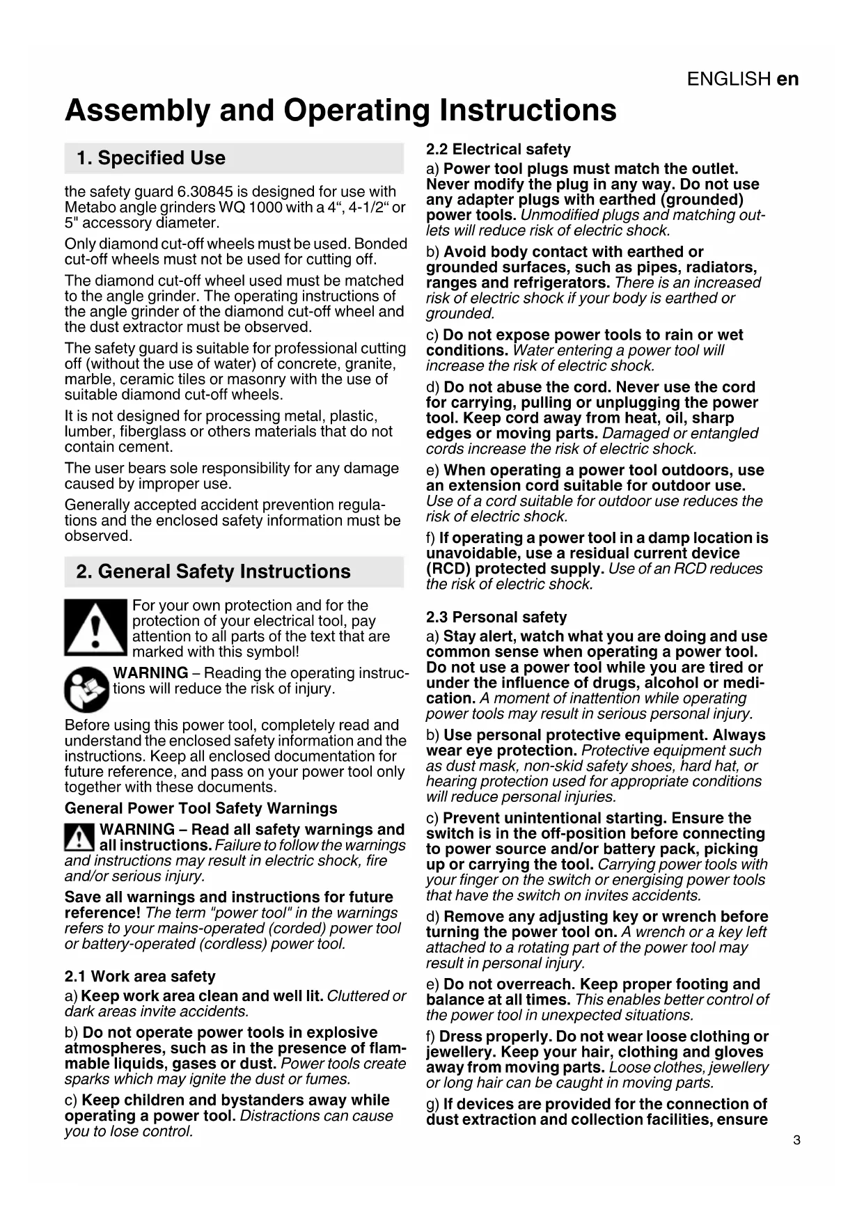 Assembly and Operating Instructions the safety guard 6.30845 is designed for use with Metabo angle grinders WQ 1000 with a 4“, 4-1/2“ or 5" accessory diameter. Only diamond cut-off wheels must be used. Bonded cut-off wheels must not be used for cutting off. The diamond cut-off wheel used must be matched to the angle grinder. The operating instructions of the angle grinder of the diamond cut-off wheel and the dust extractor must be observed. The safety guard is suitable for professional cutting off (without the use of water) of concrete, granite, marble, ceramic tiles or masonry with the use of suitable diamond cut-off wheels. It is not designed for processing metal, plastic, lumber, fiberglass or others materials that do not contain cement. The user bears sole responsibility for any damage caused by improper use. Generally accepted accident prevention regula- tions and the enclosed safety information must be observed. For your own protection and for the protection of your electrical tool, pay attention to all parts of the text that are marked with this symbol! WARNING – Reading the operating instruc- tions will reduce the risk of injury. Before using this power tool, completely read and understand the enclosed safety information and the instructions. Keep all enclosed documentation for future reference, and pass on your power tool only together with these documents. General Power Tool Safety Warnings WARNING – Read all safety warnings and all instructions. Failure to follow the warnings and instructions may result in electric shock, fire and/or serious injury. Save all warnings and instructions for future reference! The term "power tool" in the warnings refers to your mains-operated (corded) power tool or battery-operated (cordless) power tool.