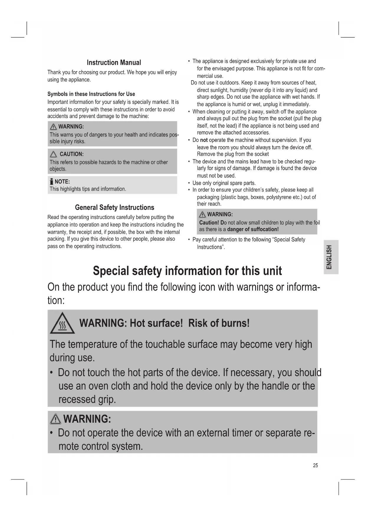 This warns you of dangers to your health and indicates pos- sible injury risks. CAUTION: This refers to possible hazards to the machine or other objects. NOTE: This highlights tips and information. General Safety Instructions Read the operating instructions carefully before putting the appliance into operation and keep the instructions including the warranty, the receipt and, if possible, the box with the internal packing. If you give this device to other people, please also pass on the operating instructions.