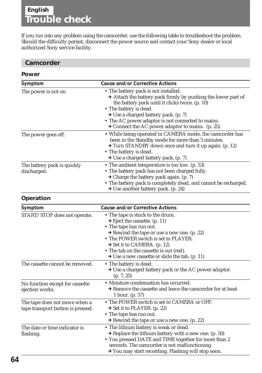 Cause and/or Corrective Actions • Set the selector to VTR (DC OUT) and disconnect the mains lead. After about one minute, try again. (p. 9) • See the following chart.