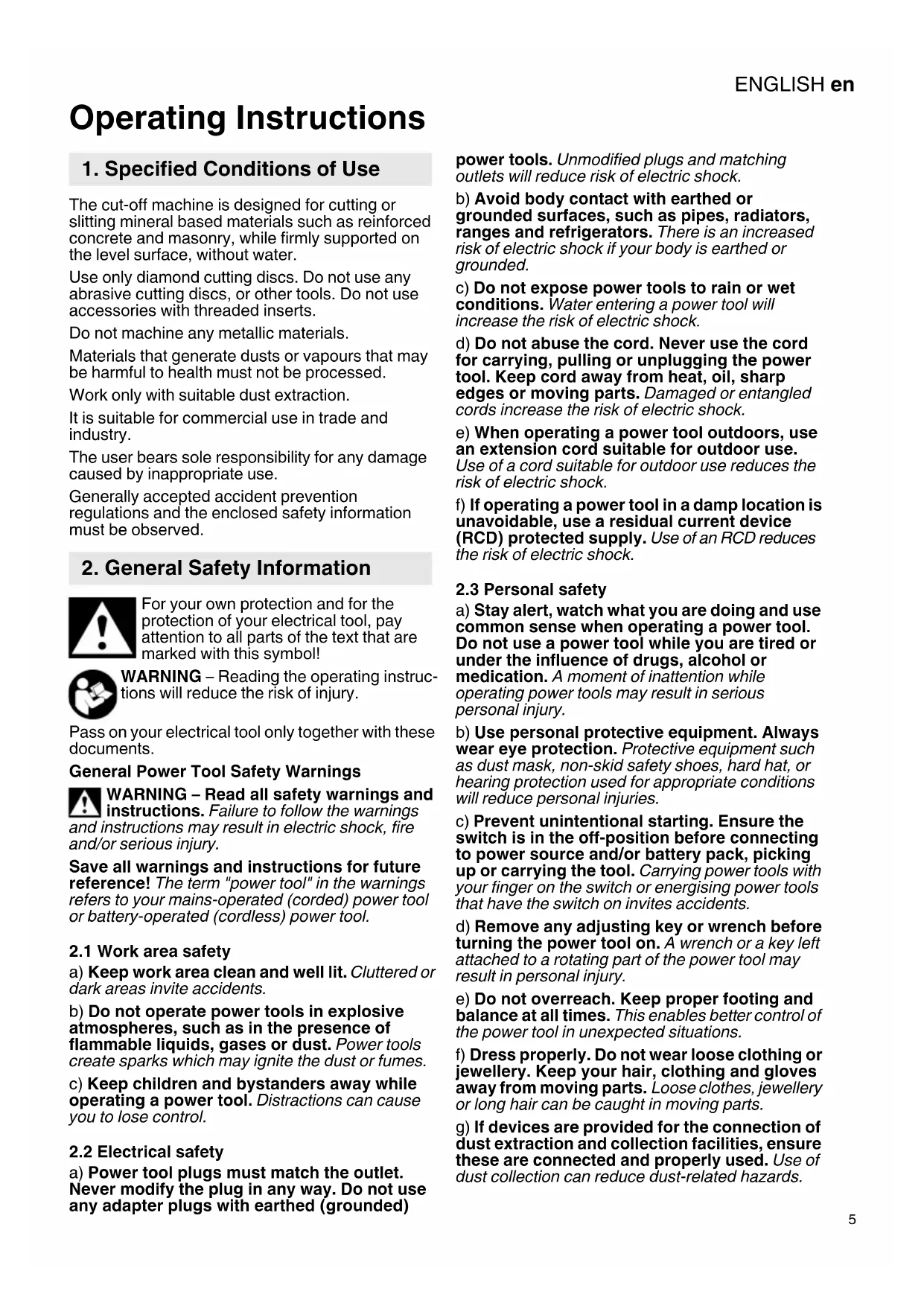 Operating Instructions The cut-off machine is designed for cutting or slitting mineral based materials such as reinforced concrete and masonry, while firmly supported on the level surface, without water. Use only diamond cutting discs. Do not use any abrasive cutting discs, or other tools. Do not use accessories with threaded inserts. Do not machine any metallic materials. Materials that generate dusts or vapours that may be harmful to health must not be processed. Work only with suitable dust extraction. It is suitable for commercial use in trade and industry. The user bears sole responsibility for any damage caused by inappropriate use. Generally accepted accident prevention regulations and the enclosed safety information must be observed. For your own protection and for the protection of your electrical tool, pay attention to all parts of the text that are marked with this symbol! WARNING – Reading the operating instruc- tions will reduce the risk of injury. Pass on your electrical tool only together with these documents. General Power Tool Safety Warnings WARNING – Read all safety warnings and instructions. Failure to follow the warnings and instructions may result in electric shock, fire and/or serious injury. Save all warnings and instructions for future reference! The term "power tool" in the warnings refers to your mains-operated (corded) power tool or battery-operated (cordless) power tool.