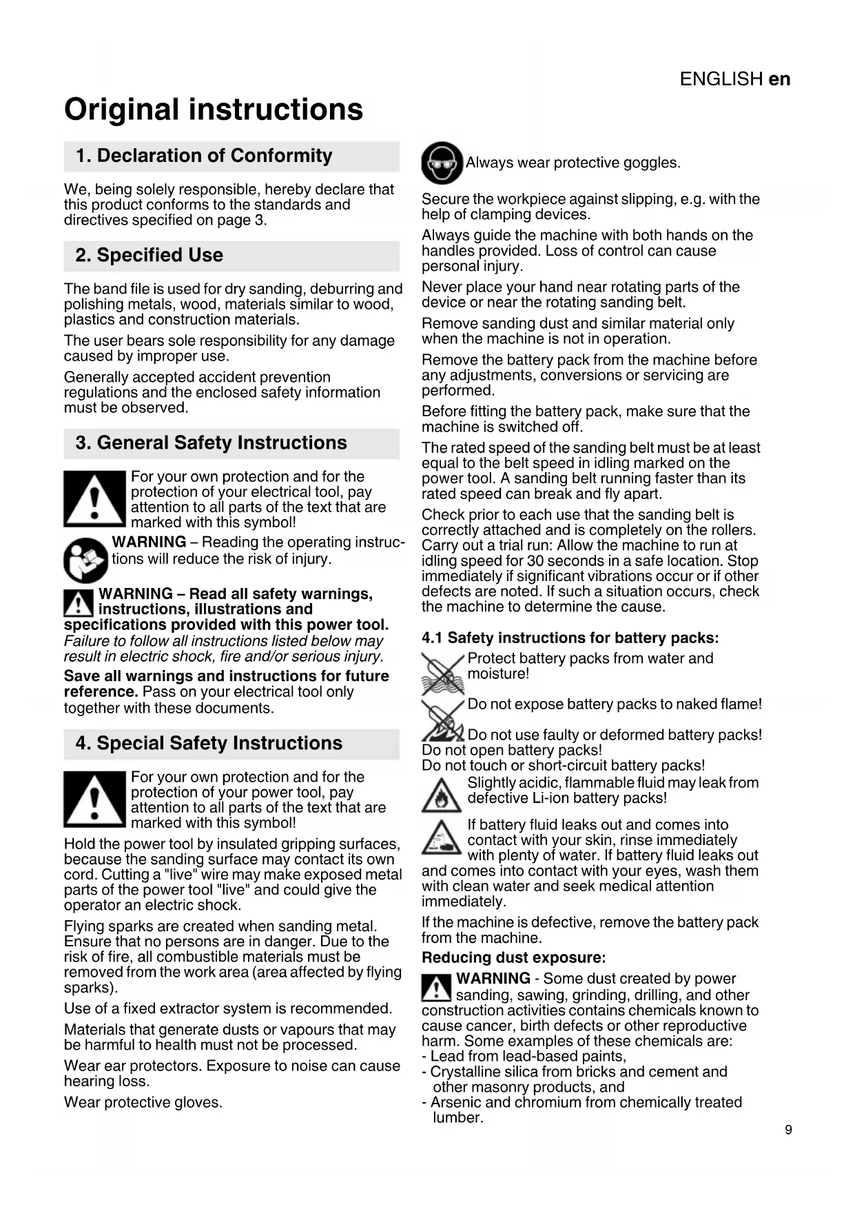 Original instructions We, being solely responsible, hereby declare that this product conforms to the standards and directives specified on page 3. The band file is used for dry sanding, deburring and polishing metals, wood, materials similar to wood, plastics and construction materials. The user bears sole responsibility for any damage caused by improper use. Generally accepted accident prevention regulations and the enclosed safety information must be observed. For your own protection and for the protection of your electrical tool, pay attention to all parts of the text that are marked with this symbol! WARNING – Reading the operating instruc- tions will reduce the risk of injury. WARNING – Read all safety warnings, instructions, illustrations and specifications provided with this power tool. Failure to follow all instructions listed below may result in electric shock, fire and/or serious injury. Save all warnings and instructions for future reference. Pass on your electrical tool only together with these documents. For your own protection and for the protection of your power tool, pay attention to all parts of the text that are marked with this symbol! Hold the power tool by insulated gripping surfaces, because the sanding surface may contact its own cord. Cutting a "live" wire may make exposed metal parts of the power tool "live" and could give the operator an electric shock. Flying sparks are created when sanding metal. Ensure that no persons are in danger. Due to the risk of fire, all combustible materials must be removed from the work area (area affected by flying sparks). Use of a fixed extractor system is recommended. Materials that generate dusts or vapours that may be harmful to health must not be processed. Wear ear protectors. Exposure to noise can cause hearing loss. Wear protective gloves. Always wear protective goggles. Secure the workpiece against slipping, e.g. with the help of clamping devices. Always guide the machine with both hands on the handles provided. Loss of control can cause personal injury. Never place your hand near rotating parts of the device or near the rotating sanding belt. Remove sanding dust and similar material only when the machine is not in operation. Remove the battery pack from the machine before any adjustments, conversions or servicing are performed. Before fitting the battery pack, make sure that the machine is switched off. The rated speed of the sanding belt must be at least equal to the belt speed in idling marked on the power tool. A sanding belt running faster than its rated speed can break and fly apart. Check prior to each use that the sanding belt is correctly attached and is completely on the rollers. Carry out a trial run: Allow the machine to run at idling speed for 30 seconds in a safe location. Stop immediately if significant vibrations occur or if other defects are noted. If such a situation occurs, check the machine to determine the cause.