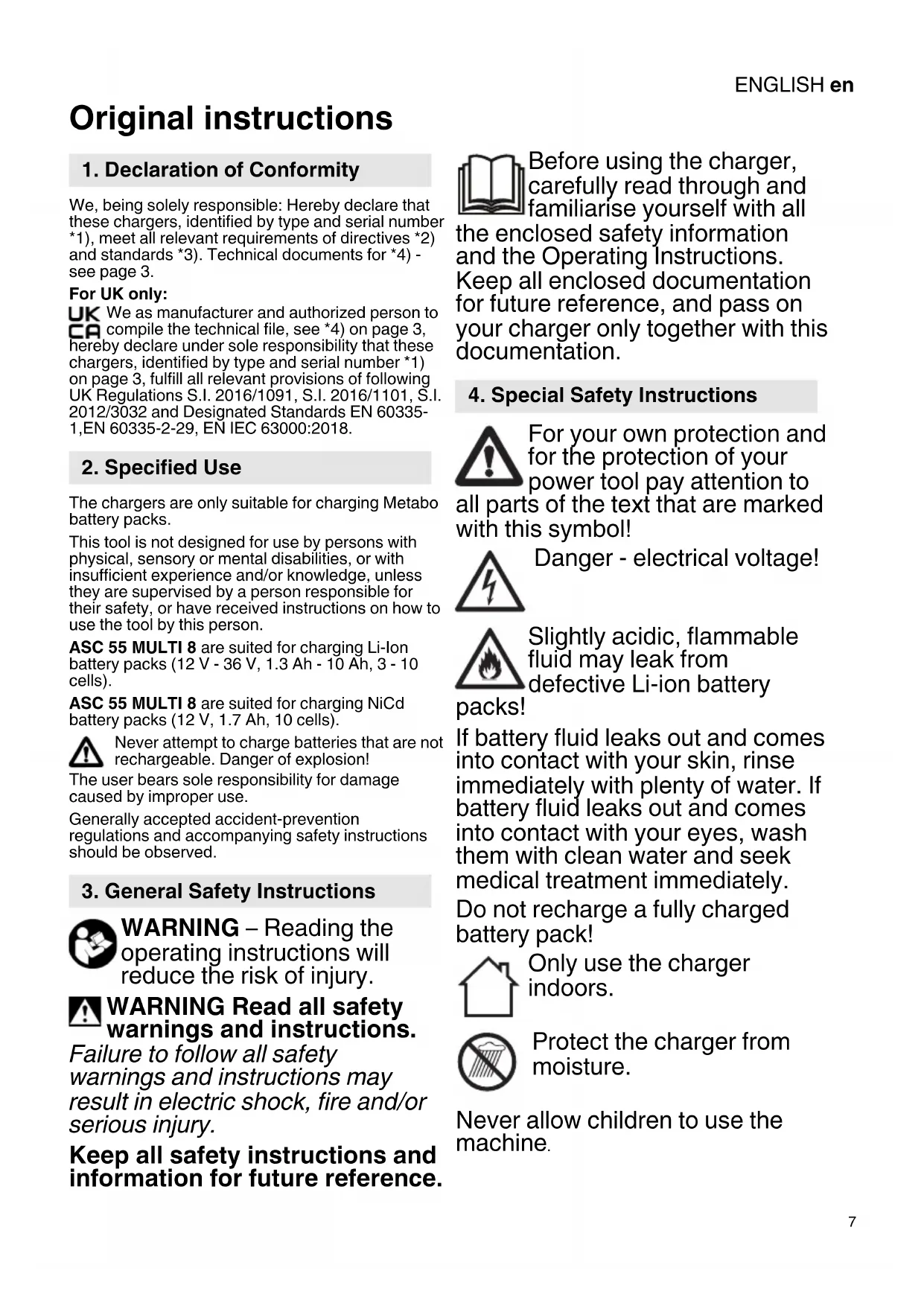 Original instructions We, being solely responsible: Hereby declare that these chargers, identified by type and serial number *1), meet all relevant requirements of directives *2) and standards *3). Technical documents for *4) - see page 3. For UK only: We as manufacturer and authorized person to compile the technical file, see *4) on page 3, hereby declare under sole responsibility that these chargers, identified by type and serial number *1) on page 3, fulfill all relevant provisions of following UK Regulations S.I. 2016/1091, S.I. 2016/1101, S.I. 2012/3032 and Designated Standards EN 60335- 1,EN 60335-2-29, EN IEC 63000:2018. The chargers are only suitable for charging Metabo battery packs. This tool is not designed for use by persons with physical, sensory or mental disabilities, or with insufficient experience and/or knowledge, unless they are supervised by a person responsible for their safety, or have received instructions on how to use the tool by this person. ASC 55 MULTI 8 are suited for charging Li-Ion battery packs (12 V - 36 V, 1.3 Ah - 10 Ah, 3 - 10 cells). ASC 55 MULTI 8 are suited for charging NiCd battery packs (12 V, 1.7 Ah, 10 cells). Never attempt to charge batteries that are not rechargeable. Danger of explosion! The user bears sole responsibility for damage caused by improper use. Generally accepted accident-prevention regulations and accompanying safety instructions should be observed. WARNING – Reading the operating instructions will reduce the risk of injury. WARNING Read all safety warnings and instructions. Failure to follow all safety warnings and instructions may result in electric shock, fire and/or serious injury. Keep all safety instructions and information for future reference. Before using the charger, carefully read through and familiarise yourself with all the enclosed safety information and the Operating Instructions. Keep all enclosed documentation for future reference, and pass on your charger only together with this documentation. For your own protection and for the protection of your power tool pay attention to all parts of the text that are marked with this symbol! Danger - electrical voltage! Slightly acidic, flammable fluid may leak from defective Li-ion battery packs! If battery fluid leaks out and comes into contact with your skin, rinse immediately with plenty of water. If battery fluid leaks out and comes into contact with your eyes, wash them with clean water and seek medical treatment immediately. Do not recharge a fully charged battery pack! Only use the charger indoors. Protect the charger from moisture. Never allow children to use the machine