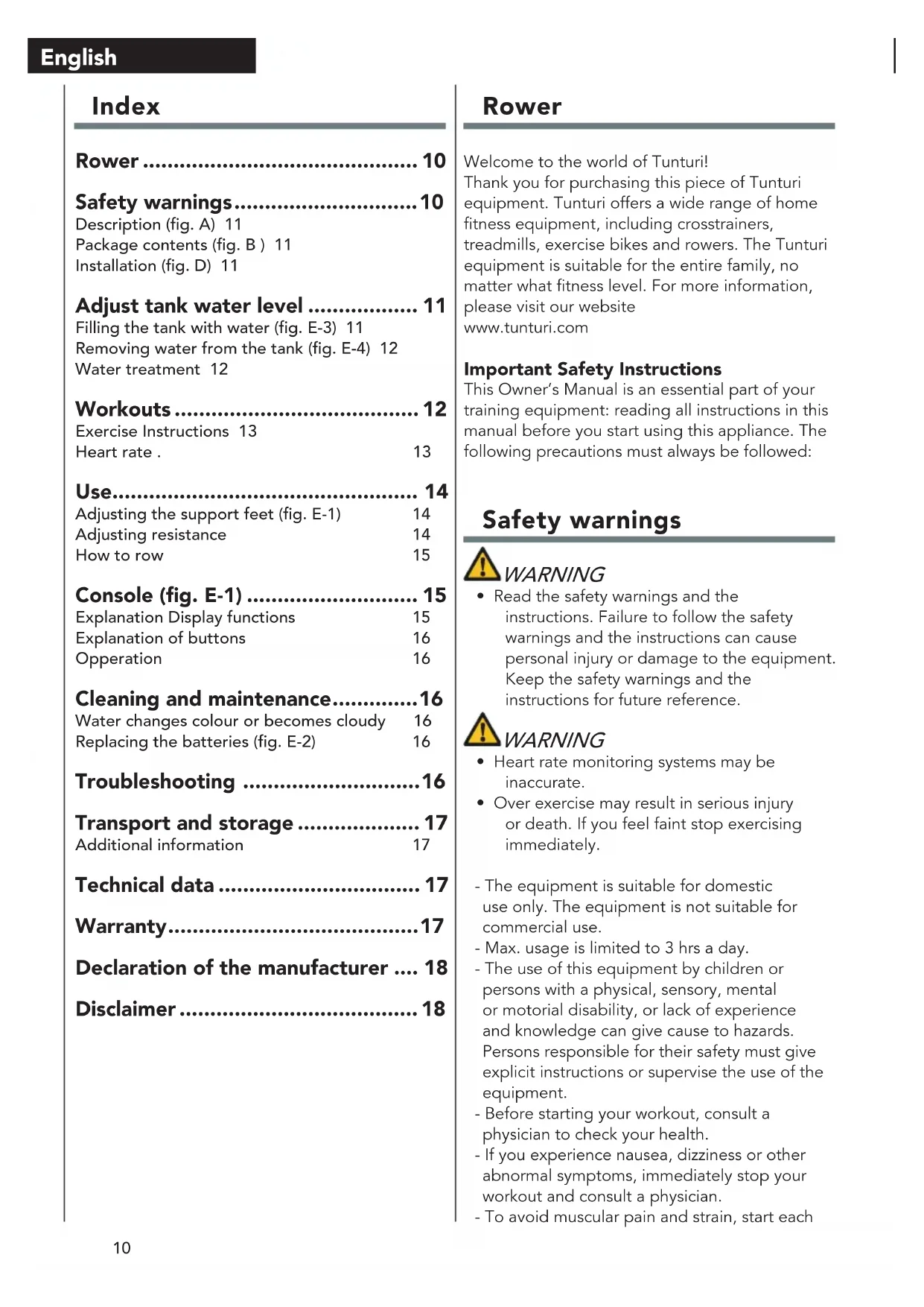- Heart rate monitoring systems may be inaccurate. • Over exercise may result in serious injury or death. If you feel faint stop exercising immediately. - The equipment is suitable for domestic use only. The equipment is not suitable for commercial use. - Max. usage is limited to 3 hrs a day. - The use of this equipment by children or persons with a physical, sensory, mental or motorial disability, or lack of experience and knowledge can give cause to hazards. Persons responsible for their safety must give explicit instructions or supervise the use of the equipment. - Before starting your workout, consult a physician to check your health. - If you experience nausea, dizziness or other abnormal symptoms, immediately stop your workout and consult a physician. - To avoid muscular pain and strain, start each Index Rower ............................................. 10 Safety warnings .............................. 10 Description (g. A) 11Package contents (g. B ) 11Installation (g. D) 11 Adjust tank water level .................. 11 Filling the tank with water (g. E-3) 11Removing water from the tank (g. E-4) 12Water treatment 12 Workouts ........................................ 12 Exercise Instructions 13Heart rate . 13 Use.................................................. 14 Adjusting the support feet (g. E-1) 14Adjusting resistance 14How to row 15 Console (g. E-1) ............................ 15 Explanation Display functions 15Explanation of buttons 16Opperation 16 Cleaning and maintenance .............. 16 Water changes colour or becomes cloudy 16Replacing the batteries (g. E-2) 16 Troubleshooting ............................. 16 Transport and storage .................... 17 Additional information 17 Technical data ................................. 17 Warranty ......................................... 17 Declaration of the manufacturer .... 18 Disclaimer ....................................... 1811 English workout by warming up and finish each workout by cooling down. Remember to stretch at the end of the workout. - The equipment is suitable for indoor use only. The equipment is not suitable for outdoor use. - Only use the equipment in environments with adequate ventilation. Do not use the equipment in draughty environments in order not to catch a cold. - Only use the equipment in environments with ambient temperatures between 10 °C and 35 °C. Only store the equipment in environments with ambient temperatures between 5 °C and 45 °C. - Do not use or store the equipment in humid surroundings. The air humidity must never be more than 80%. - Only use the equipment for its intended purpose. Do not use the equipment for other purposes than described in the manual. - Do not use the equipment if any part is damaged or defective. If a part is damaged or defective, contact your dealer. - Keep your hands, feet and other body parts away from the moving parts. - Keep your hair away from the moving parts. - Wear appropriate clothing and shoes. - Keep clothing, jewellery and other objects away from the moving parts. - Make sure that only one person uses the equipment at a time. The equipment must not be used by persons weighing more than 135 kg (300 lbs). - Do not open equipment without consulting your dealer. Description (fig. A) Your rower is a piece of stationary fitness equipment used to simulate rowing without causing excessive pressure to the joints. Package contents (fig. B ) - The package contains the parts as shown in fig. B. NOTE