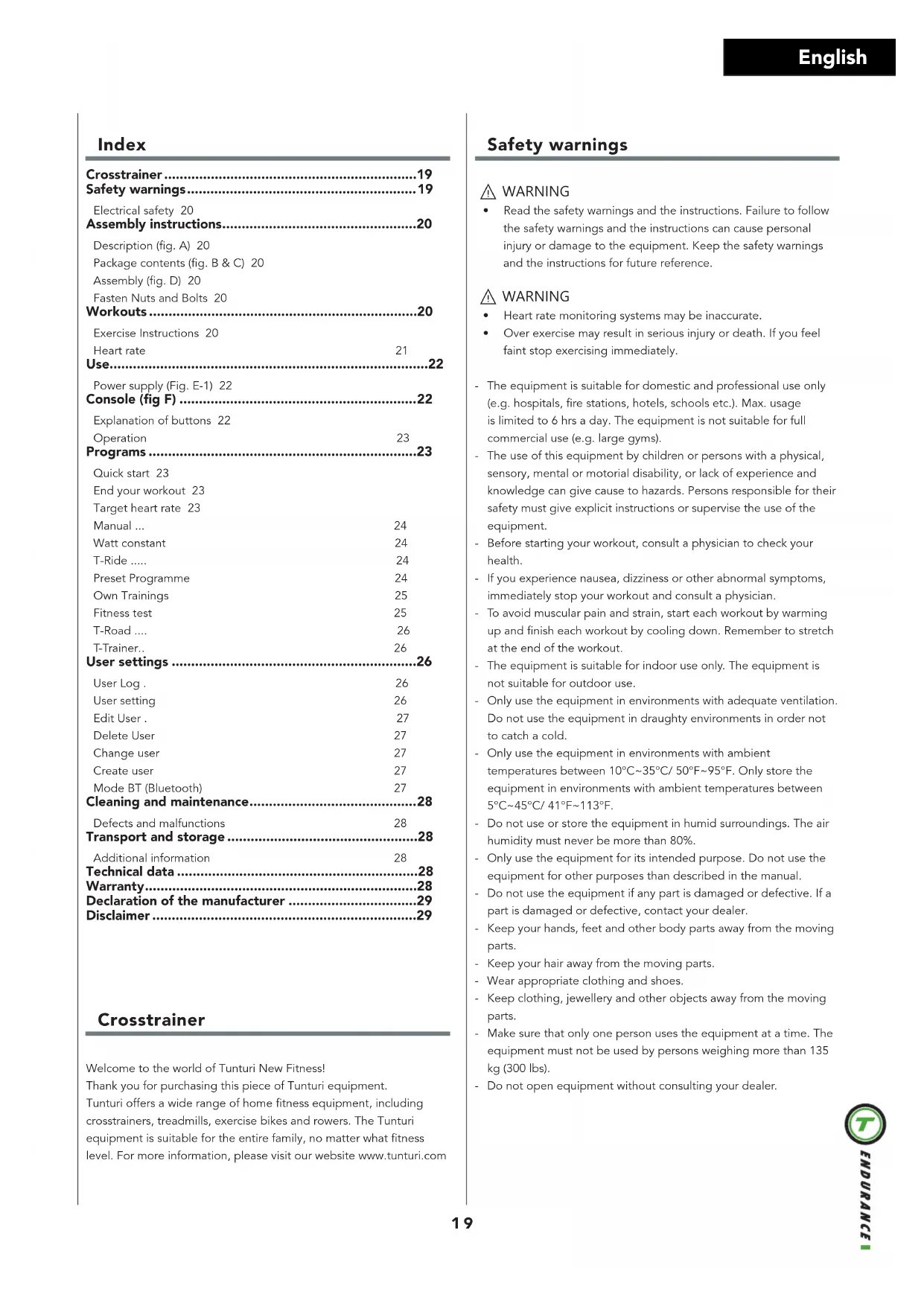- Disclaimer Crosstrainer Welcome to the world of Tunturi New Fitness!Thank you for purchasing this piece of Tunturi equipment. Tunturi offers a wide range of home fitness equipment, including crosstrainers, treadmills, exercise bikes and rowers. The Tunturi equipment is suitable for the entire family, no matter what fitness level. For more information, please visit our website www.tunturi.com Safety warnings ⚠ WARNING p. 29