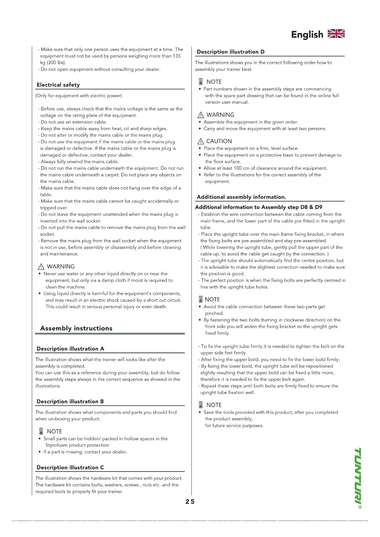 - Using liquid directly is harmful for the equipment’s components, and may result in an electric shock caused by a short cut circuit This could result in serious personal injury or even death Assembly instructions Description illustration A The illustration shows what the trainer will looks like after the assembly is completed You can use this as a reference during your assembly, but do follow the assembly steps always in the correct sequence as showed in the illustrations Description illustration B The illustration shows what components and parts you should find when un-boxing your product ‼ NOTE