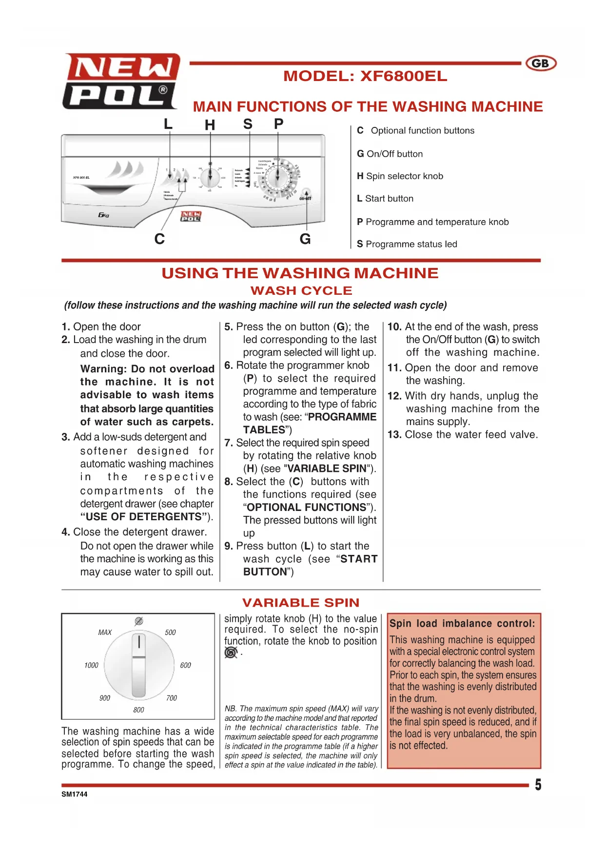 min. 0,05 MPa - max. 1 MPa MODELLO XF6800ELSpin load imbalance control:This washing machine is equippedwith a special electronic control systemfor correctly balancing the wash load.Prior to each spin, the system ensuresthat the washing is evenly distributedin the drum.If the washing is not evenly distributed,the final spin speed is reduced, and ifthe load is very unbalanced, the spinis not effected.SM1744