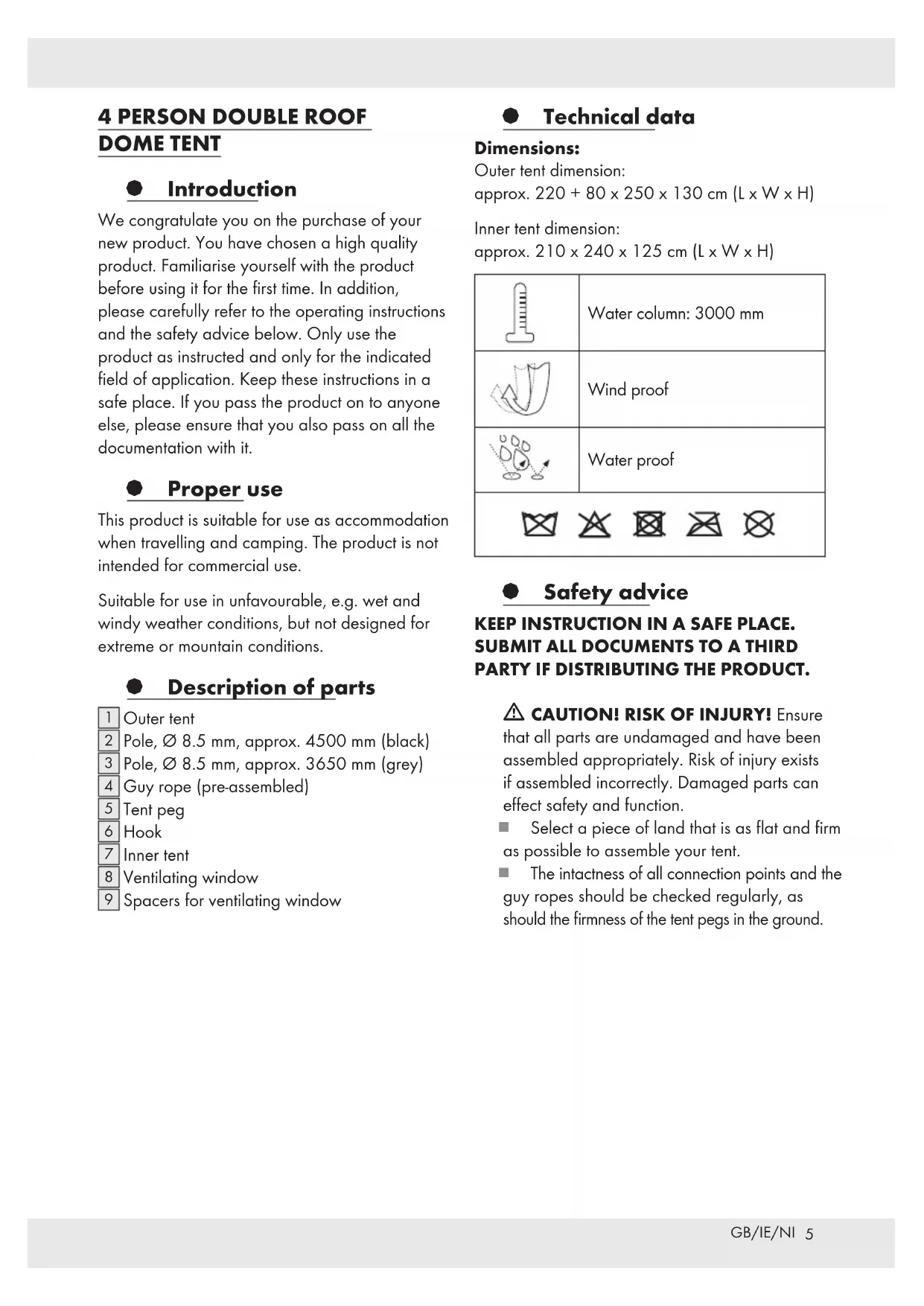 PARTY IF DISTRIBUTING THE PRODUCT. m CAUTION! RISK OF INJURY! Ensure that all parts are undamaged and have been assembled appropriately. Risk of injury exists if assembled incorrectly. Damaged parts can effect safety and function. Select a piece of land that is as flat and firm as possible to assemble your tent. The intactness of all connection points and the guy ropes should be checked regularly, as should the firmness of the tent pegs in the ground.6 GB/IE/NI Do not use any insect spray in or on the tent. Small leaks on the seams can be repaired with a seam spray and impregnation spray can be used for the tent skin. m CAUTION! DANGER OF POISONING AND DAMAGE TO PROPERTY! Do not light any fires within the product and keep it away from sources of heat. You should also familiarize yourself with the local fire protection regulations (e.g. camping site, tent pitch). Warning! Danger of suffocation! If the inside of the tent is not adequately ventilated, there is a risk of suffocation. Make sure that the vents on the side of the inner tent are not covered at any time. Do not leave children unattended in the tent. The logo on the inner tent