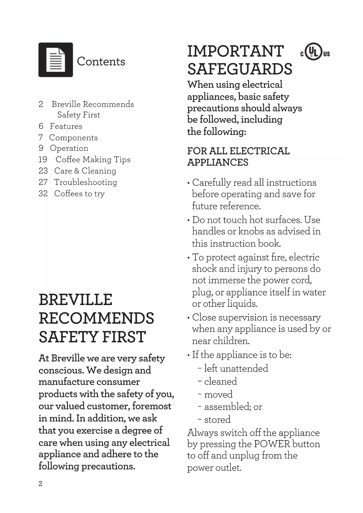 BREVILLE RECOMMENDS SAFETY FIRST At Breville we are very safety conscious. We design and manufacture consumer products with the safety of you, our valued customer, foremost in mind. In addition, we ask that you exercise a degree of care when using any electrical appliance and adhere to the following precautions. IMPORTANT SAFEGUARDS When using electrical appliances, basic safety precautions should always be followed, including the following: