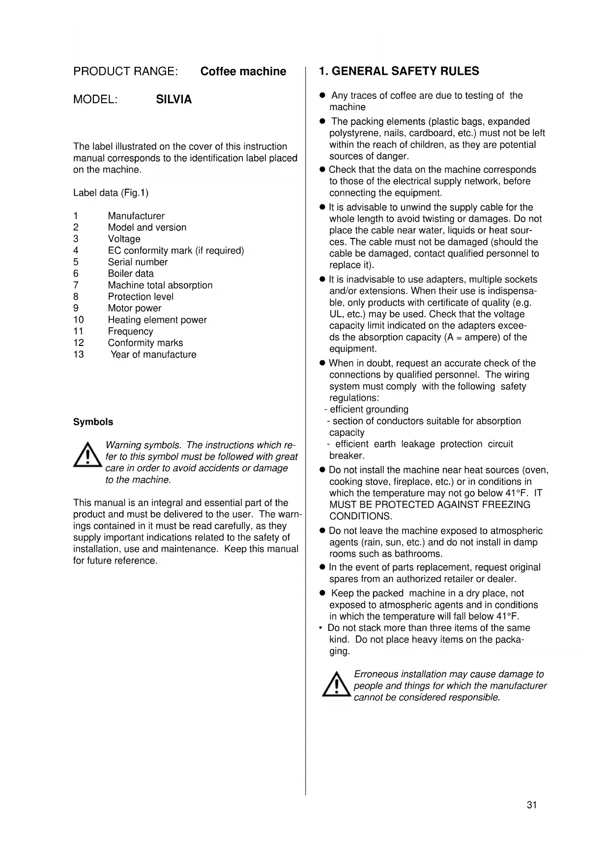 - Do not stack more than three items of the same kind. Do not place heavy items on the packa- ging. Erroneous installation may cause damage to people and things for which the manufacturer cannot be considered responsible. PRODUCT RANGE: Coffee machine MODEL: SILVIA The label illustrated on the cover of this instruction manual corresponds to the identification label placed on the machine. Label data (Fig.1) 1 Manufacturer 2 Model and version 3 Voltage 4 EC conformity mark (if required) 5 Serial number 6 Boiler data 7 Machine total absorption 8 Protection level 9 Motor power 10 Heating element power 11 Frequency 12 Conformity marks 13 Year of manufacture Symbols Warning symbols. The instructions which re- fer to this symbol must be followed with great care in order to avoid accidents or damage to the machine. This manual is an integral and essential part of the product and must be delivered to the user. The warn- ings contained in it must be read carefully, as they supply important indications related to the safety of installation, use and maintenance. Keep this manual for future reference.32 Key (Fig.2) : 1 Main power switch 2 Boiler resistance light 3 Coffee delivery switch 4 Hot water delivery switch 5 Steam delivery switch 6 Steam/water knob 7 Steam wand 8 Water tank 9 Lid 10 Drip tray 11 Discharge drawer 12 Coffee dispensing unit (group head) 13 Portafilter Accessories: 14 One two-cup portafilter with double spout 15 One one-cup filter basket 16 Coffee tamper 17 Coffee measuring scoop